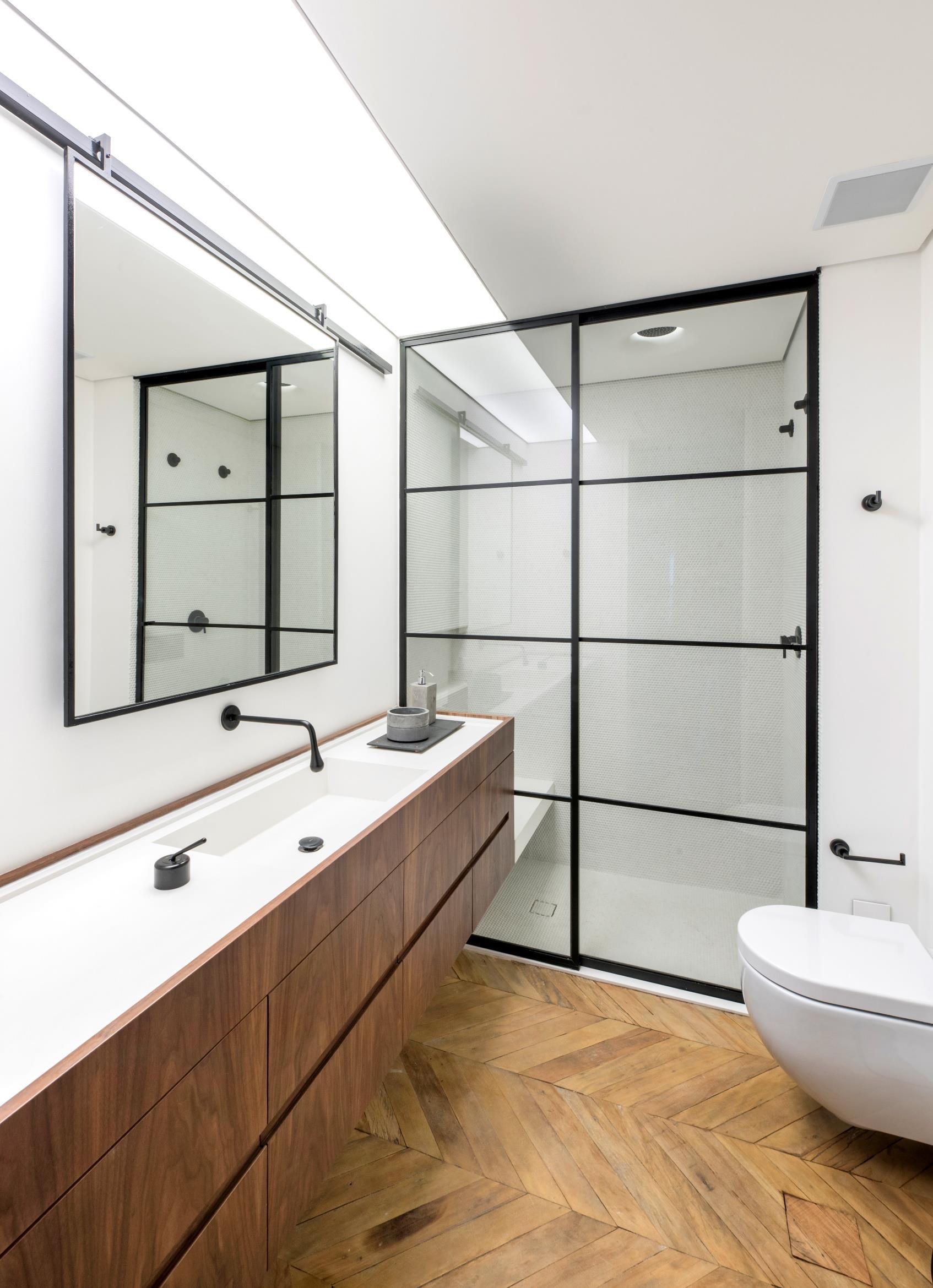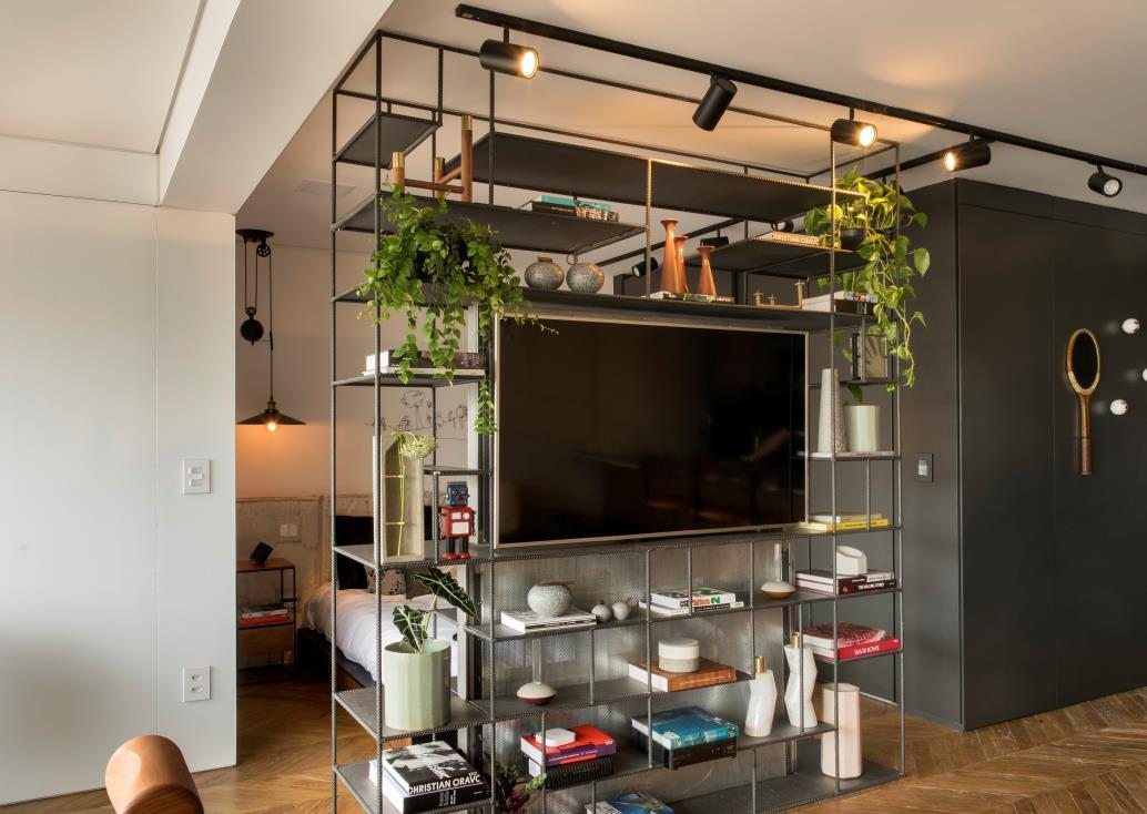 With the Upcycling concept, the reform brought major changes to prioritize the use of space. Despite the reduced footage, the changes contributed to the optimal use of the space. The room was integrated to the social area and the shelf made in rebar and metal sheets sectorized the environments, giving a privacy when the resident receives friends and family. As the original bathroom was very small, the architects reduced 30cm from the room to make it more spacious and functional, in addition to valuing the floor