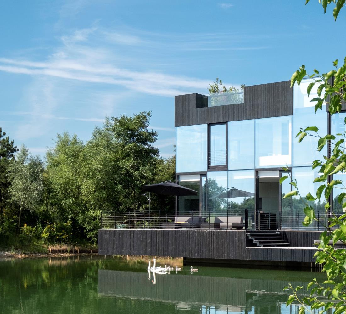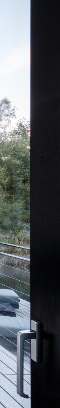 Terraces on two different levels connect the villa to both the land and the water, anchoring the house in nature and giving it a welcoming presence. Glass corner windows in the living room, kitchen and other rooms, make the residents feel like they live on the water Between the house and the adjacent plot, a hilly finger of land with tall trees ensures privacy. By curving the bridge that connects the villa to the main road, the row of trees remains intact. This further increases the sense of privacy and blocks disturbing lights from the traffic.