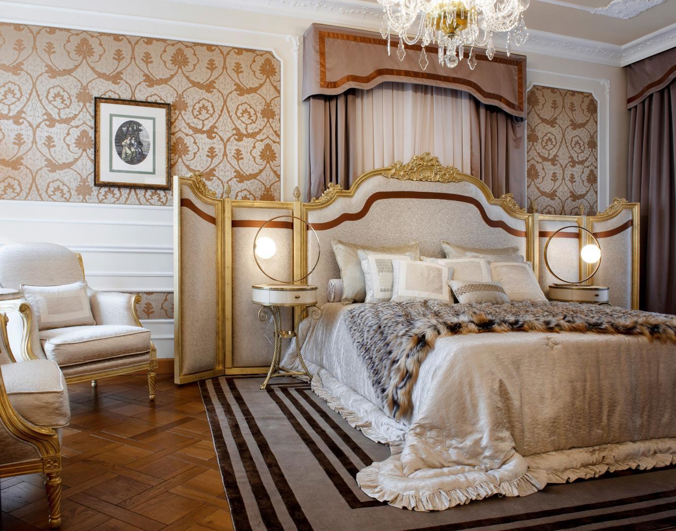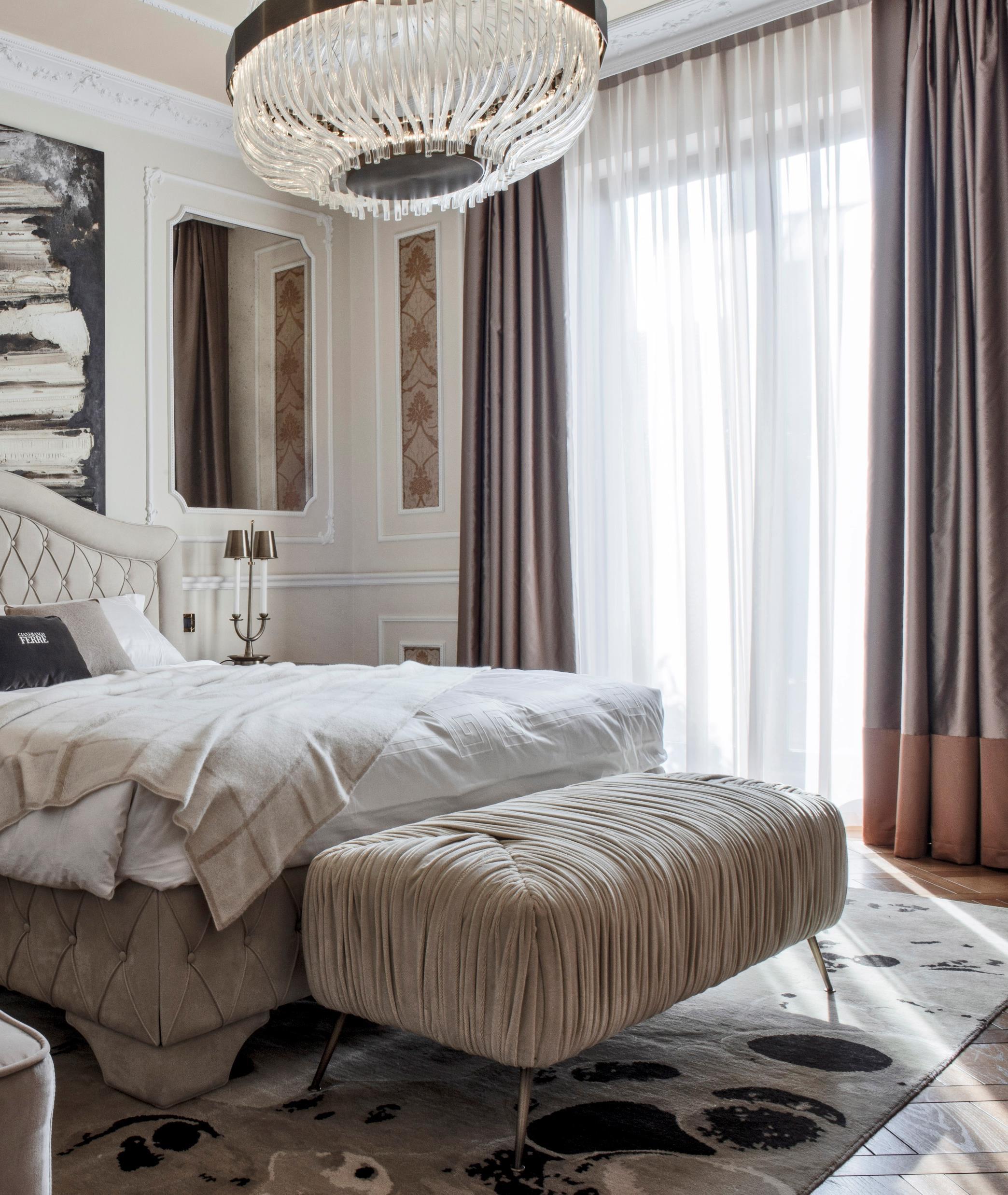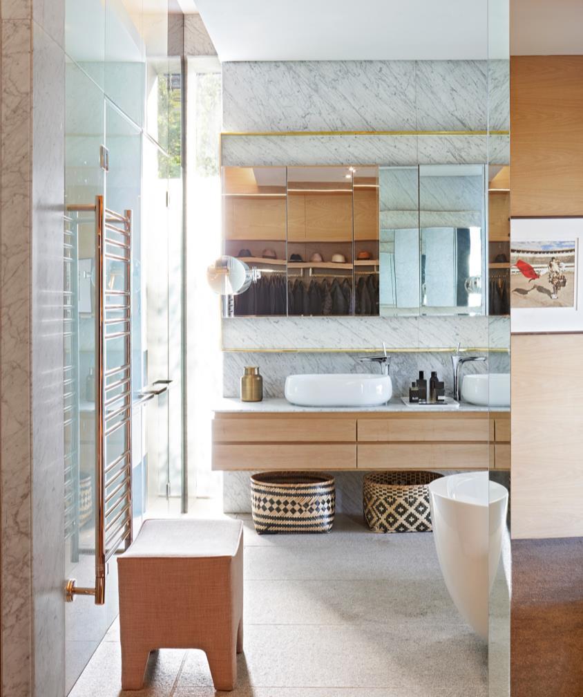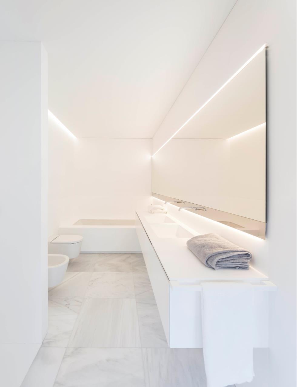 panelled walls, which also create the illusion of vertical space. A touch of classy chic is added through the custom patterned low bed, the IC lamp by Michael Anastasiades for Flos and the side tables with copper finish. Minimalistic luxury defines the seamless bathroom - a standing tub, sliding doors from black toned glass and a mirror wall create a relaxing vibe in this personal space.
