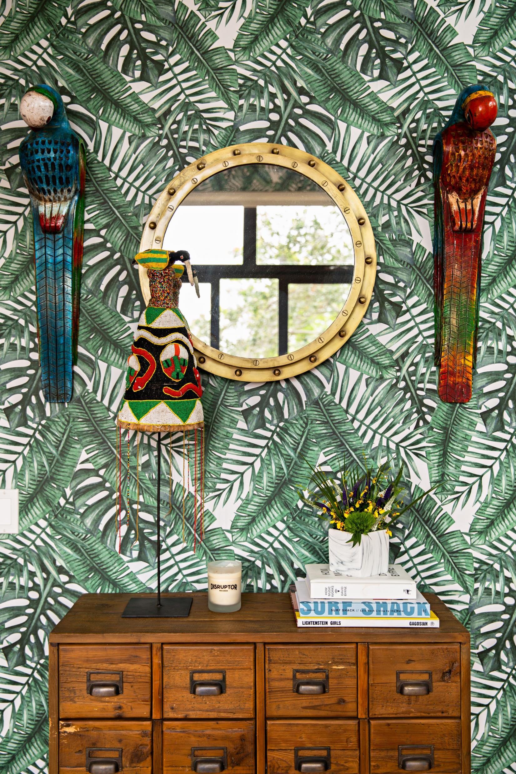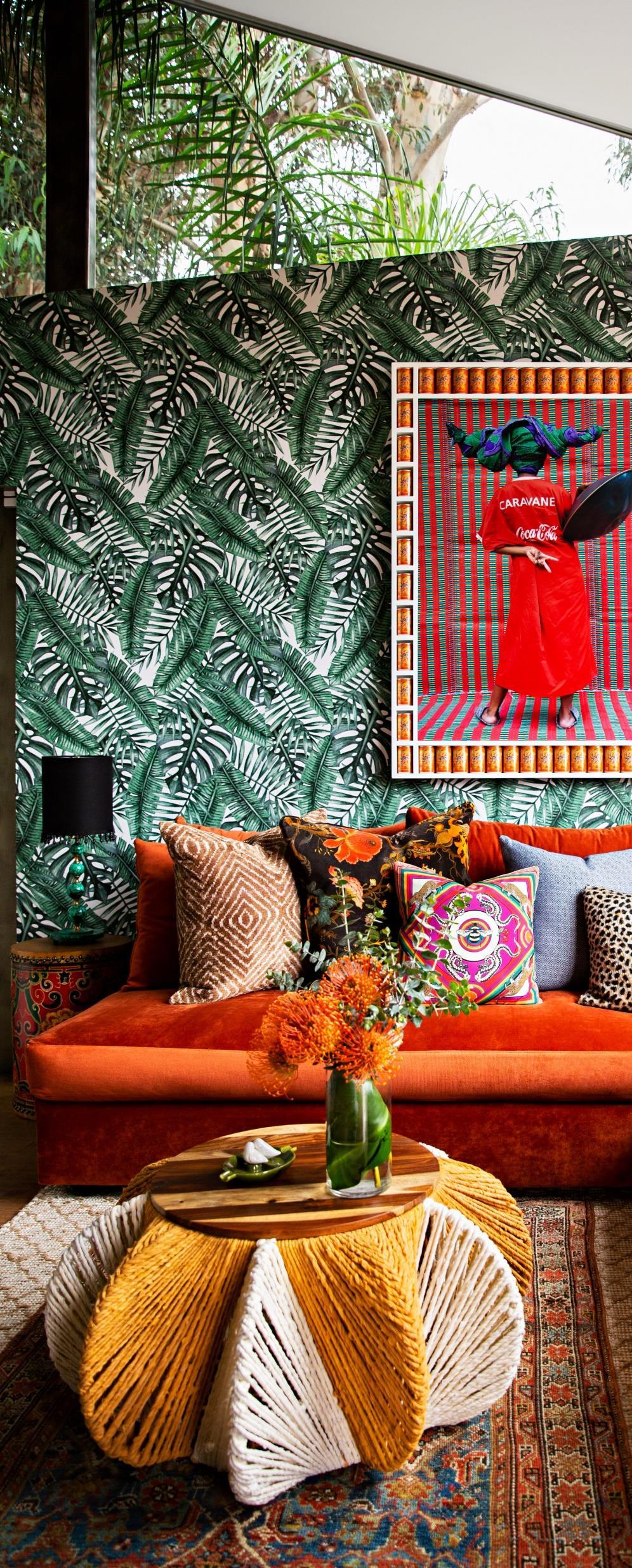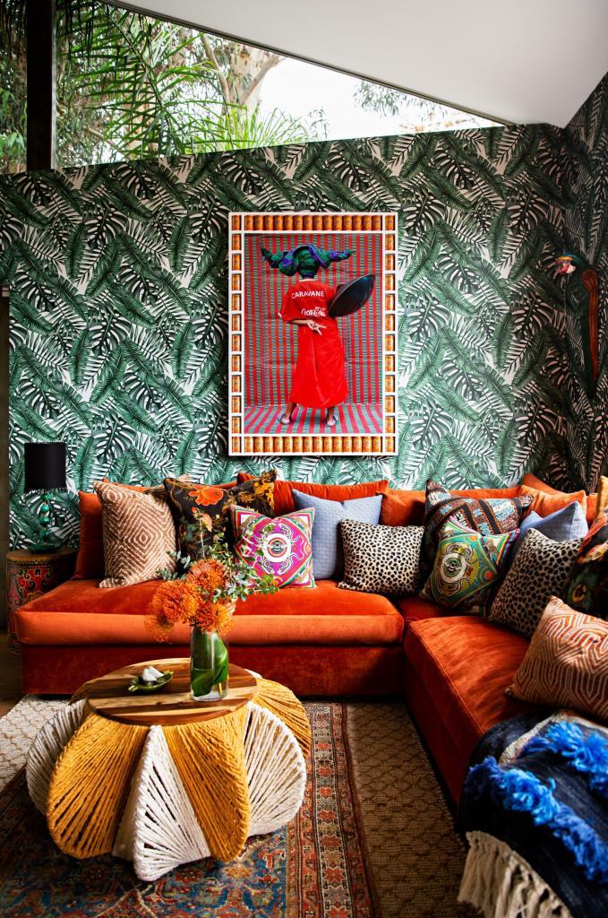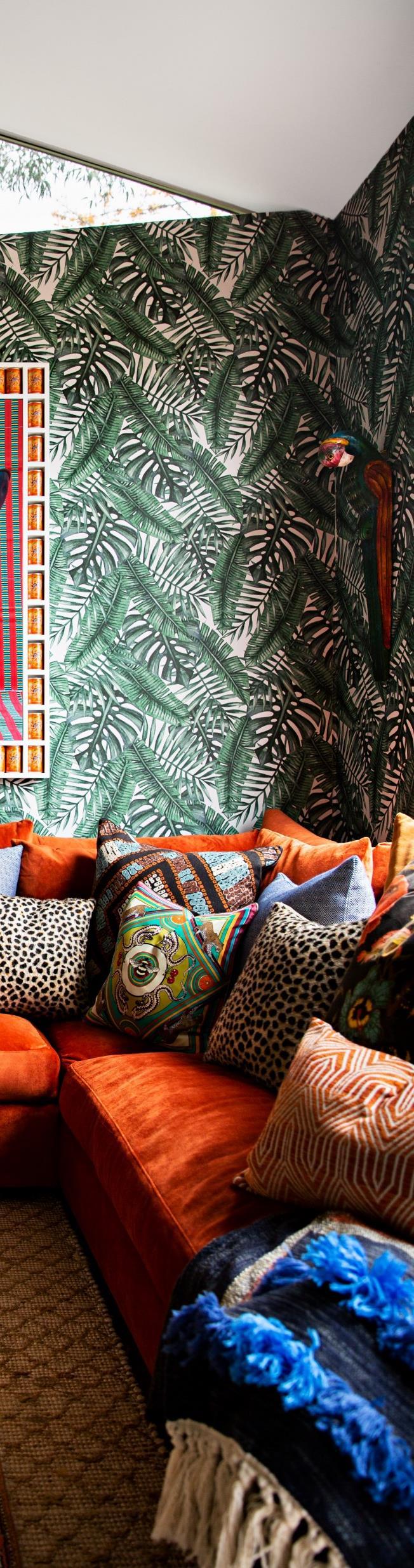 Mr. Pall had already installed the naturethemed wallpaper and the orange-velvet a couch in the family room when Ms Lau began decorating the house. She continued the interior-jungle theme, as she called it, with a natural-fiber coffee table that evokes dried versions of the leaves on the wall, and leopard and tribal-print pillows.