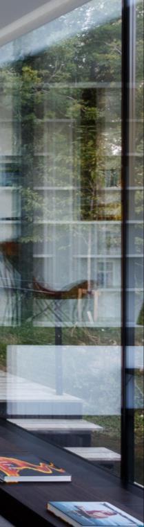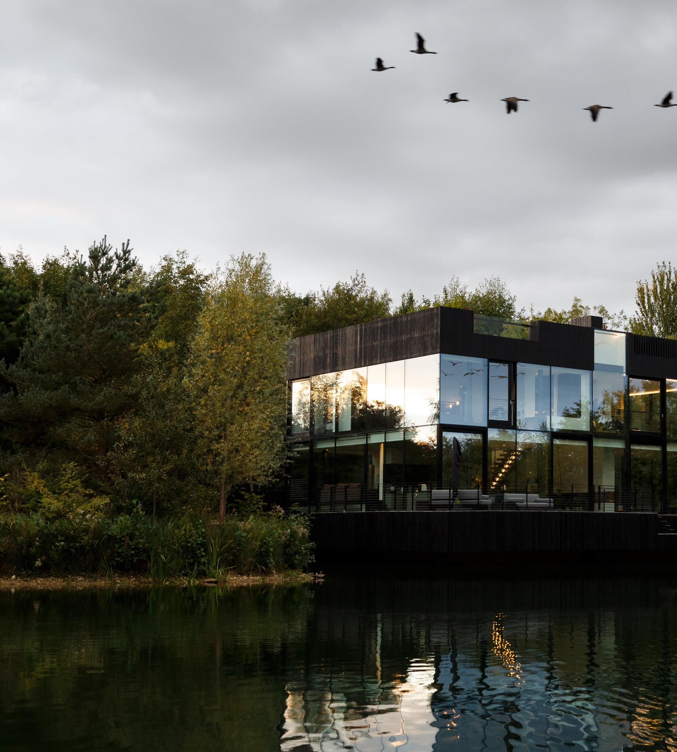Interior elements such as the fireplace and storage cupboards, divide the house into different places, creating more intimate and private areas within the large transparent volume. In the heart of the house, a fullheight void connects all levels and creates another series of diagonal and vertical sight lines. The staircase sews all the rooms together into one interior space. The central atrium brings abundant daylight into the sunken basement and connects the interior to the roof terrace. From the roof terrace, one can enjoy panoramic views as if floating quietly over the expanse of the lake.