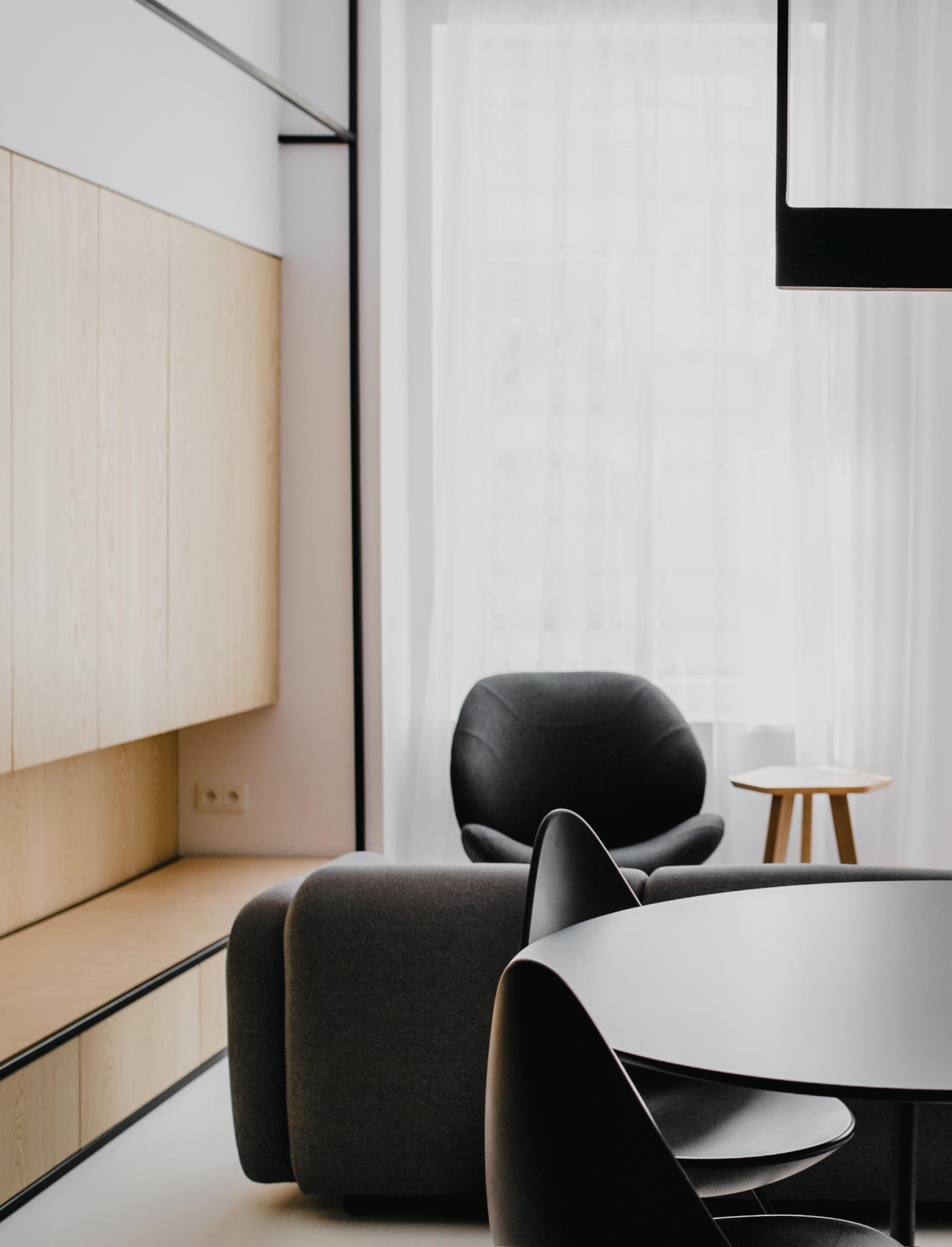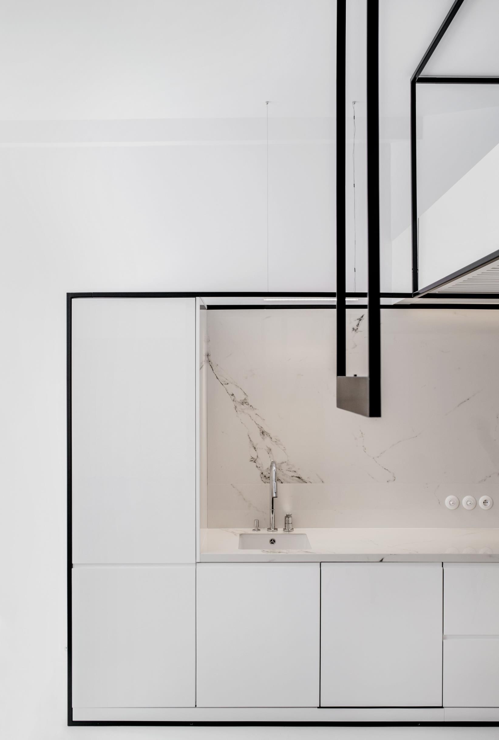 MUS ARCHITECTS presents the apartment near Wawel Castle in Cracow. The character of its interior is created by skeleton of solids levitating in space. Black frames organize a functional program by emphasizing its components.