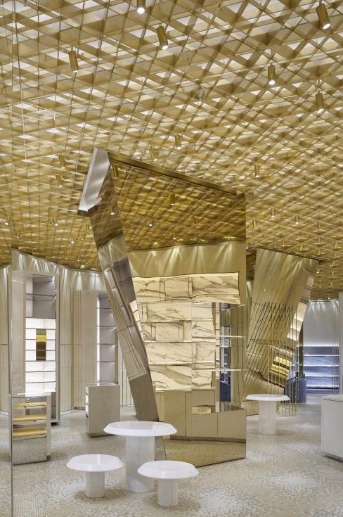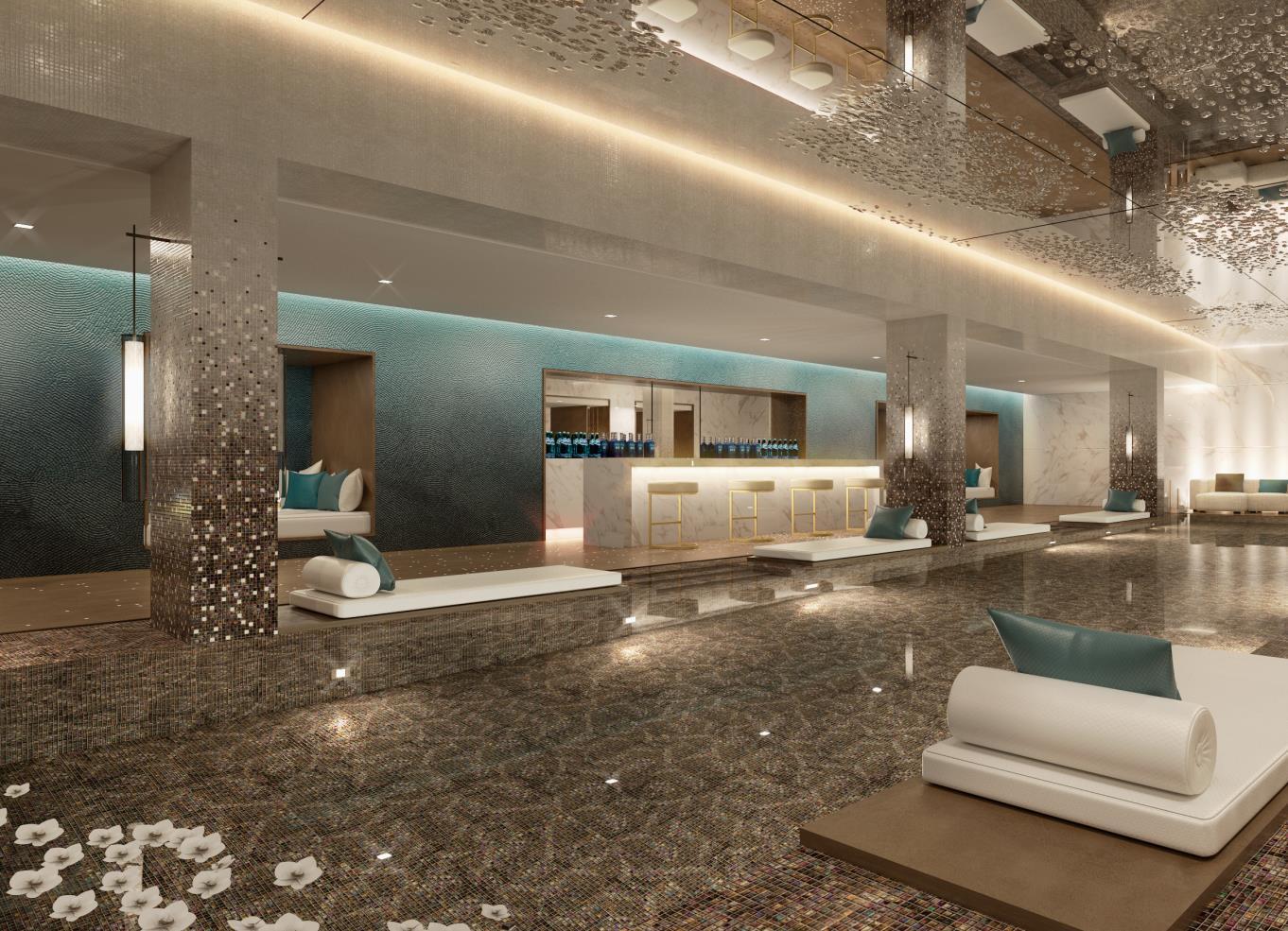 The first level is the active floor where the gym, the pool and a spa cafe are located. It’s fresh and vibrant with the use of white marble and amber tone woods. The spa pool is evidently a favorite of Josselin: the design studio played with a circular pattern of iridescent clear glass mosaic from Italy, which sparkles like diamonds. The canopy above the pool, made of stainless steel mesh wrapped in iridescent orange fabric, lit from below looks like a cloud of smoke floating above the water. It will be striking and also an amazing background for all the events happening on the terrace next door. The second level is the passive floor with the treatment rooms, a manicure pedicure area overlooking a Zen like sky garden and a Hammam. Saddle wood floors are associated to darker veneers for a more relaxing, moodier feel. The changing rooms are divided into smaller areas to give an intimate residential feel to the space. High gloss red lacquer is used inside the lockers for a surprising rich contrast. The sharp apex of the tower has been dedicated to specific spa areas such as the Hammam and the fitness studio. The former is inspired by a traditional Turkish Hammam with more contemporary finishes.