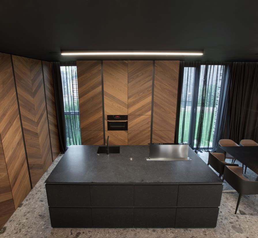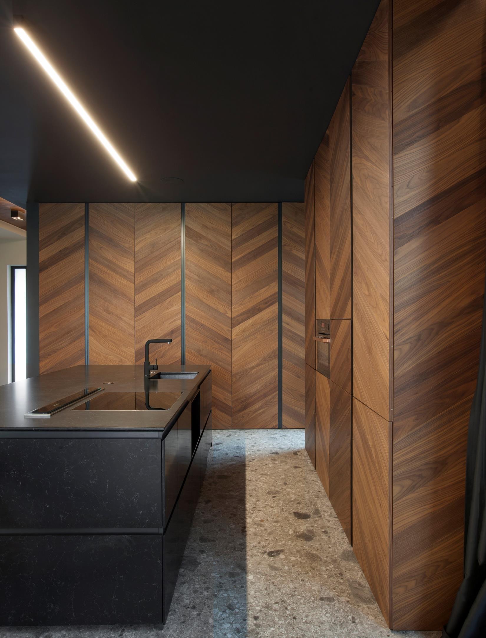 The spacious living room juxtaposes warmth of tone and delicacy to the trendy terrazzo tiled floor, yet this contrast is symbiotic and makes the composition appear timeless. Soft underglow draws the attention to the interaction of wood and stone The wood pattern corresponds with the geometry of the custom made bookshelf, visually separated from the floor and ceiling creating a sense of a floating sculpture The aerial motif is reiterated with the lamps by Flos and Sattler. Sofa and armchair by Saba. The copper nuances and the fine construction of the cocktail tables and the Brokis lamp add further warmth and sophistication. The kitchen is minimalistic, yet with an abundance of architectural decor. The metal frame connects the two house levels vertically. Its patterns follow the geometry of the roof pitch, as well as the raster of herringbone wood panels that cover the cabinets (design by ALL in Studio) - a refreshingly surreal effect that contrasts with the traditional setup. Two lighting fixtures (Etch and Tom Dixon) mark the dining zone. Dining table by Andrew World, chairs by Pedralli.