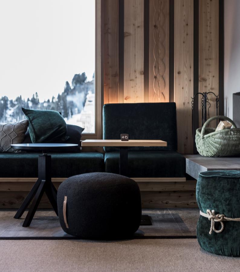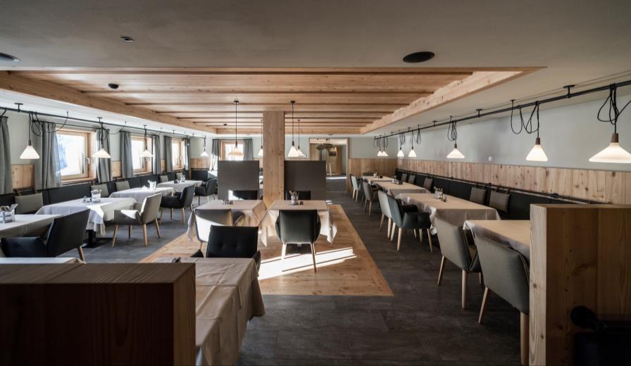 The central body of the historic lodge has been maintained but completely redesigned in the internal layout of the ground floor: the new interior design incorporates the reception, the lobby, the lounge and the restaurant. The restaurant and the lounge area have been designed to accommodate external guests as well: many skiers stop for lunch, seeing as the refuge is located on the main ski slopes of the Alpe di Siusi mountain range, while the lounge is very popular during the evenings. However, hotel guests can count on a more private and familiar area, which is focused around the large fireplace.