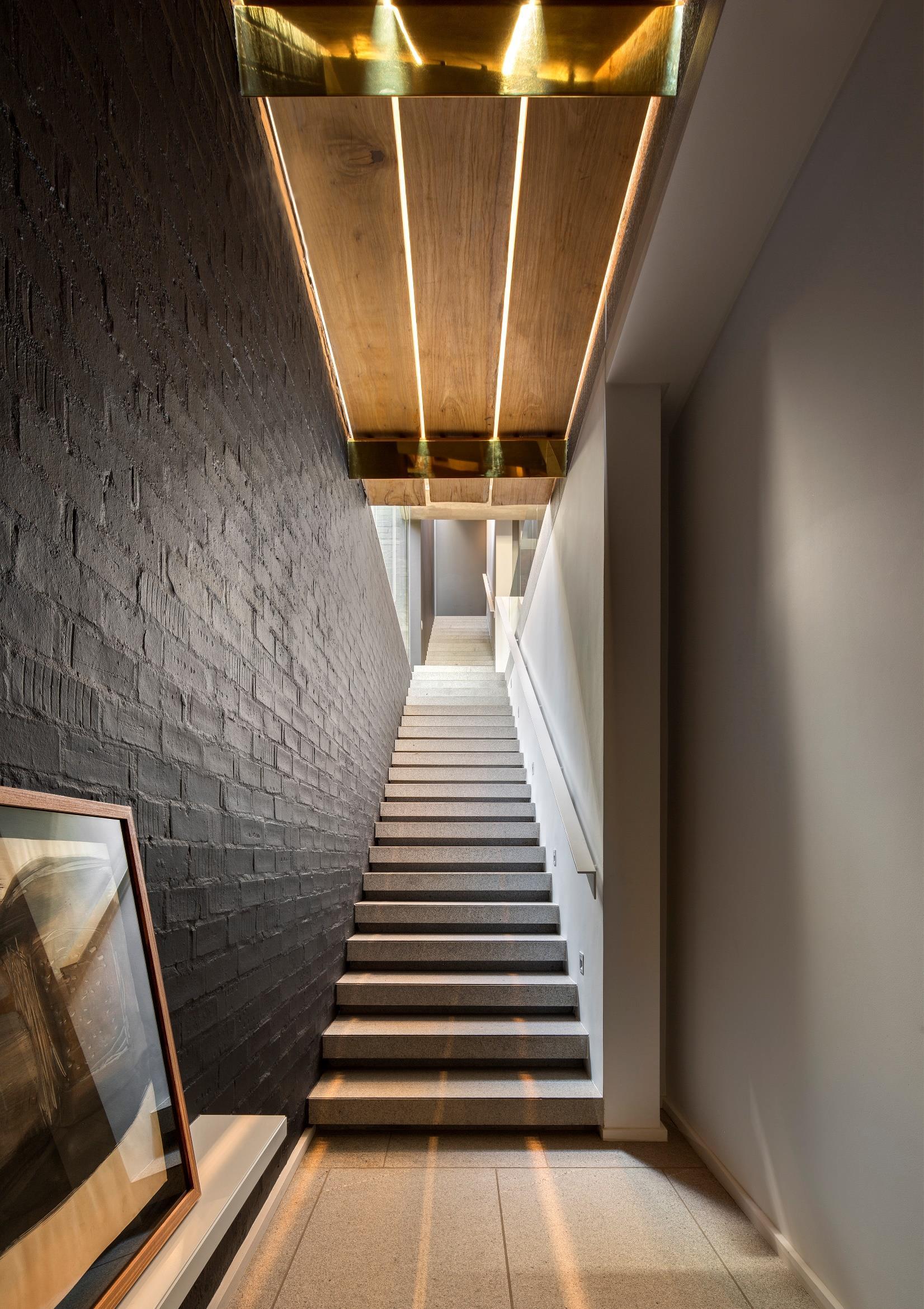 The dark exterior breaks down the mass of the building pushing it into the background. Internally, colours are muted and the use of a washed oak gives the spaces warmth The sophisticated spaces were furnished using OKHA furniture. The Hunt Sofa, the Nate, Nicci Nouveau, Vince and Miles Armchairs are placed on the upper and middle levels and the Planalto Dining Table creates a focal point adjacent to the second floor courtyard, which is used as a working/personal space OKHA also provided the To Be One and Lean On Me floor lamps in the lounge area.