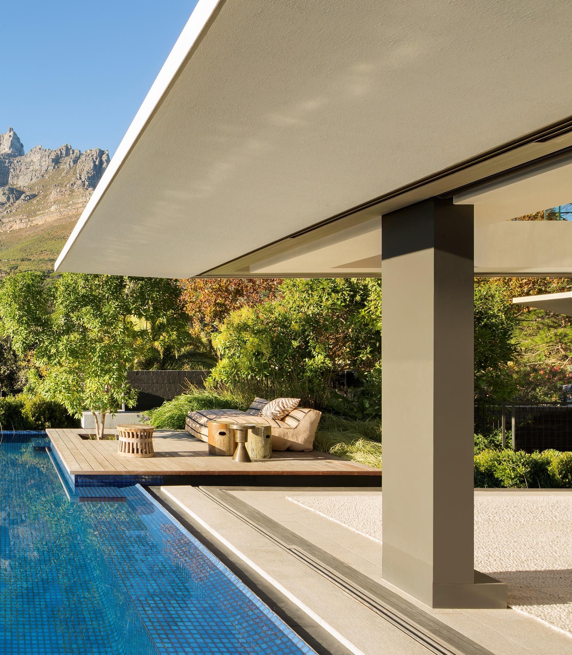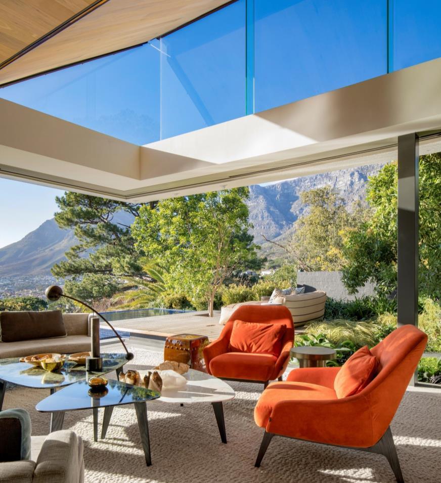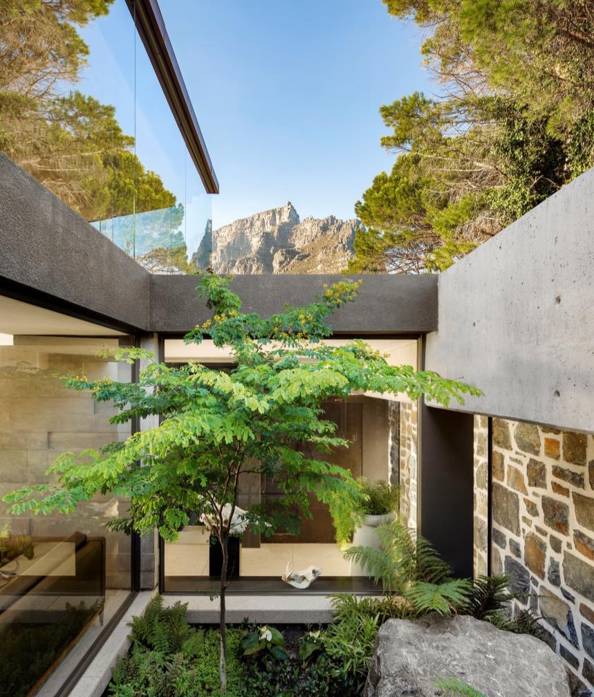 he strongest gesture is the inverted pyramid roof which creates a clerestory window around the upper level. It allows the building to open up, capturing views of Table Mountain and Lion’s Head that would otherwise have been lost. This has also opened up views of the sky bringing the sun and moon into the home, heightening the connection to nature and its cycles
