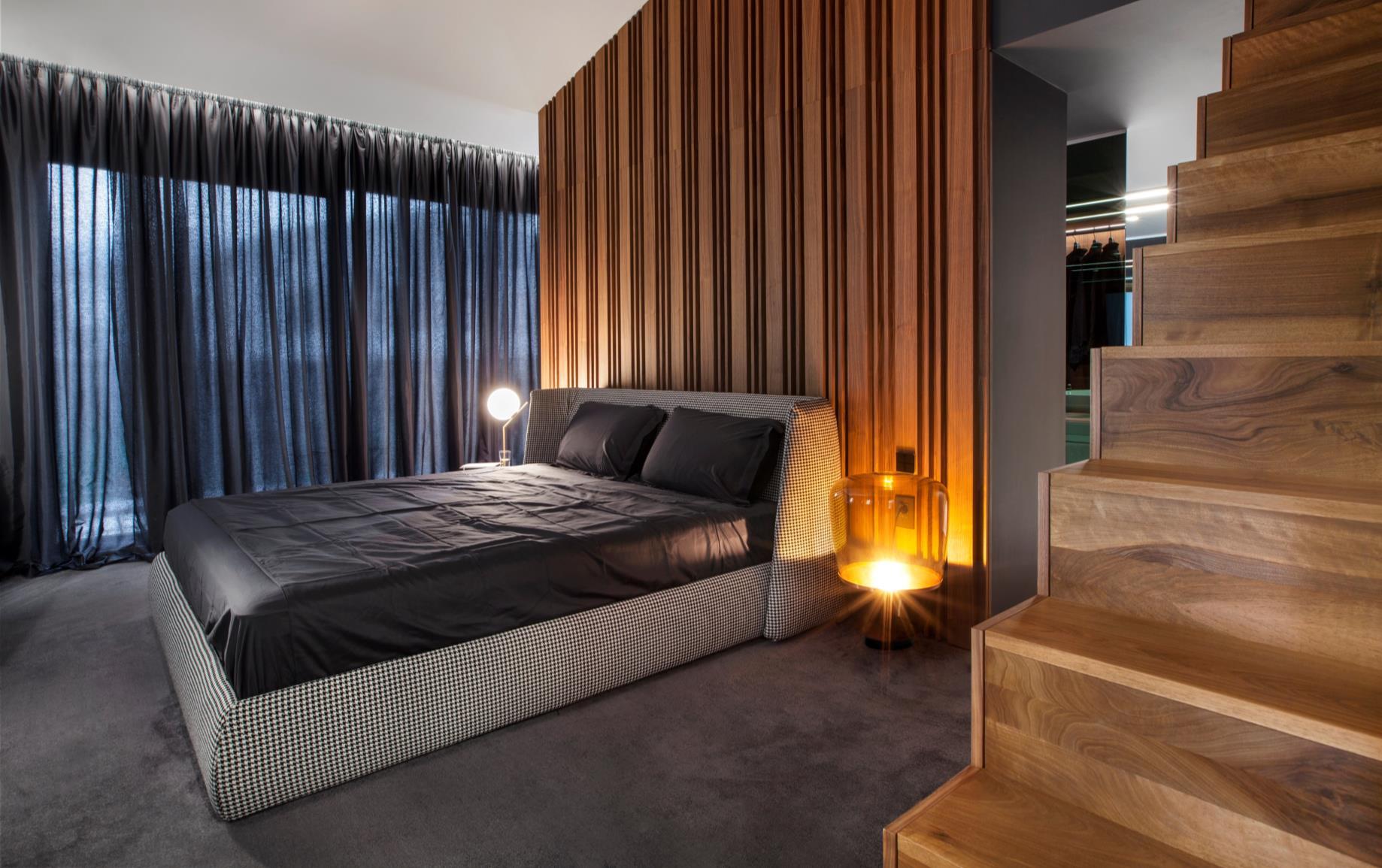 Calm and intimate atmosphere in the master bedroom is achieved through the wood