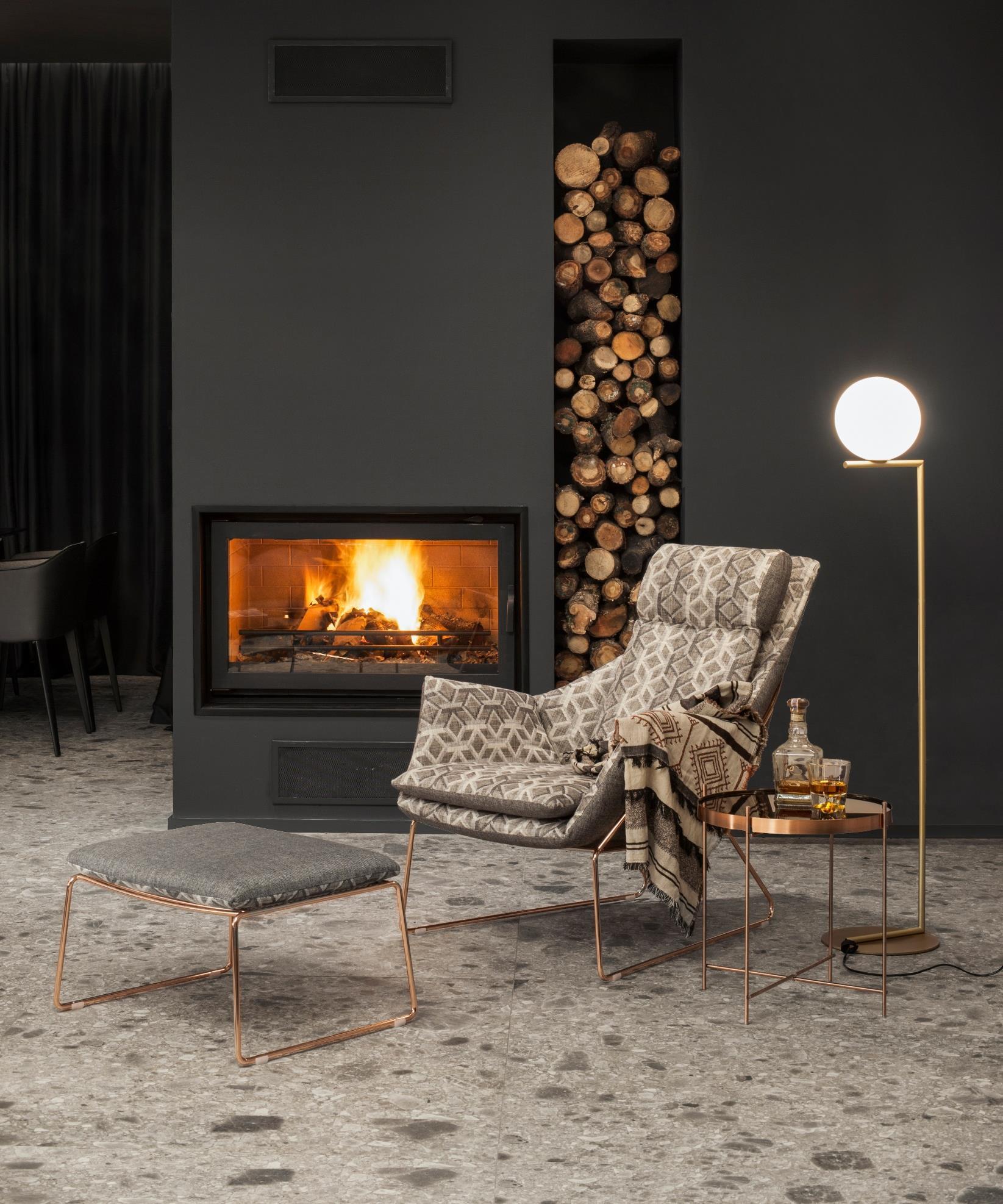 From a volume definition perspective, the fireplace separates the dining zone from the living room, but it carries an even more important function - as an archetype of warmth and love within the home. The simplistic form and the dark graphite tone draw attention to the mystic charm of fire. The tubular copper frame of the Saba armchair and the copper finish of the side table lend a warm edge to the room. The standing lamp by Flos offers a gentle graphic glow.