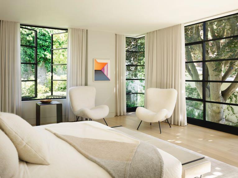 a majestic spiral staircase leading to the upper floors, and from here you can already understand the design applied to the whole house: a calm atmosphere, characterized by muted tones like beige, gray, white and cream chosen by the interior designer Chloe Warner from Redmond Aldrich Design. A gray and warm brown colored rug leads directly to the center of the house where the living room was placed that showcases an artful execution of elegant, minimalist comfort. Contemporary statement pieces, such the cast plaster Rose Uniacke table, add depth among the layered neutrals. Casement windows and long wool curtains create a warm, cozy atmosphere while maintaining the room’s expansive feel.