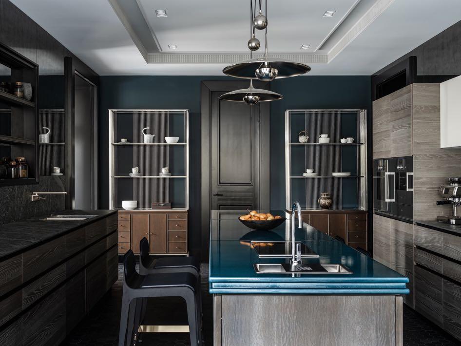 The kitchen is made mostly in dark tones with different finishes. What stands out most is the shade of dark blue that we find on the work panel of the island positioned in the center of the room and the wall that acts as a background.
