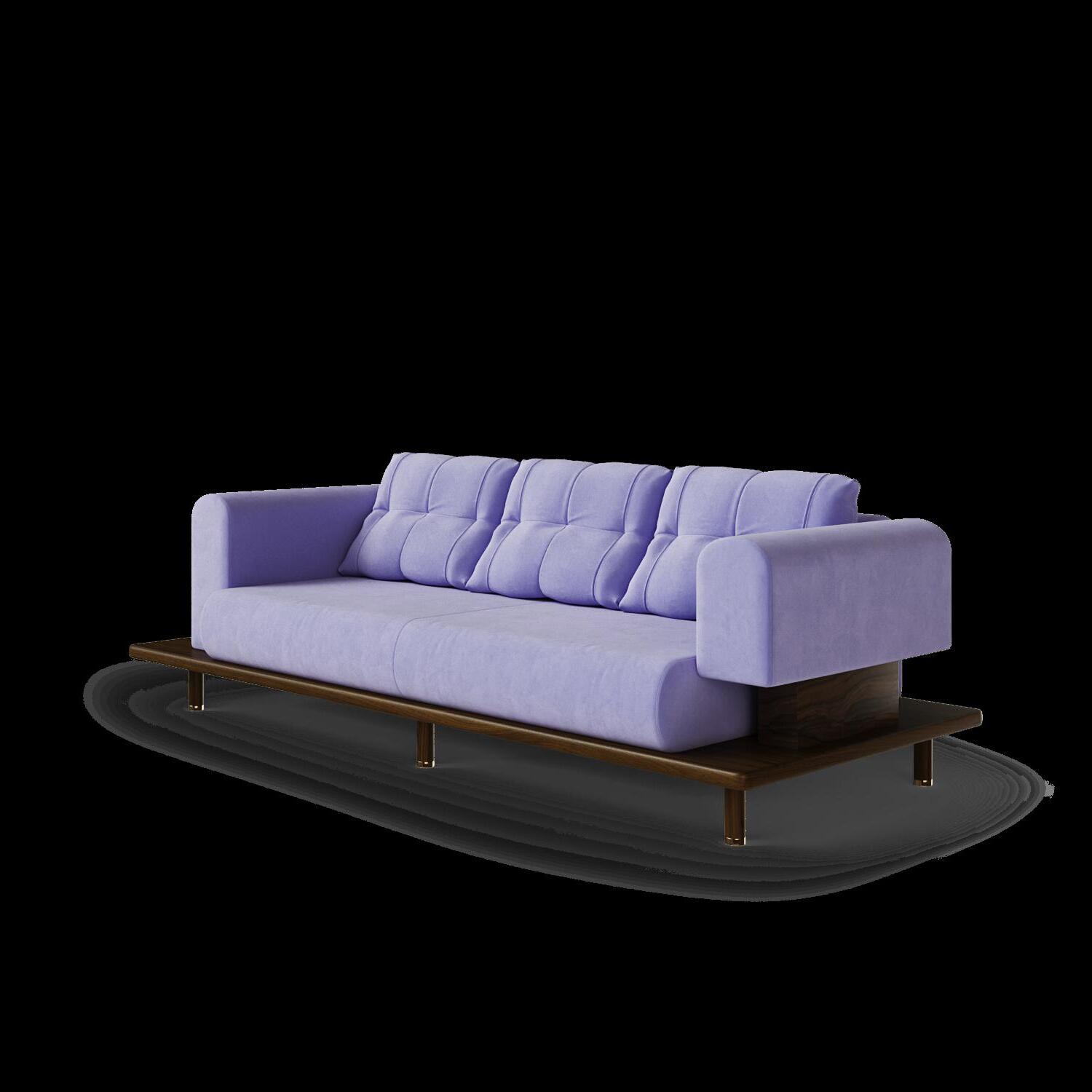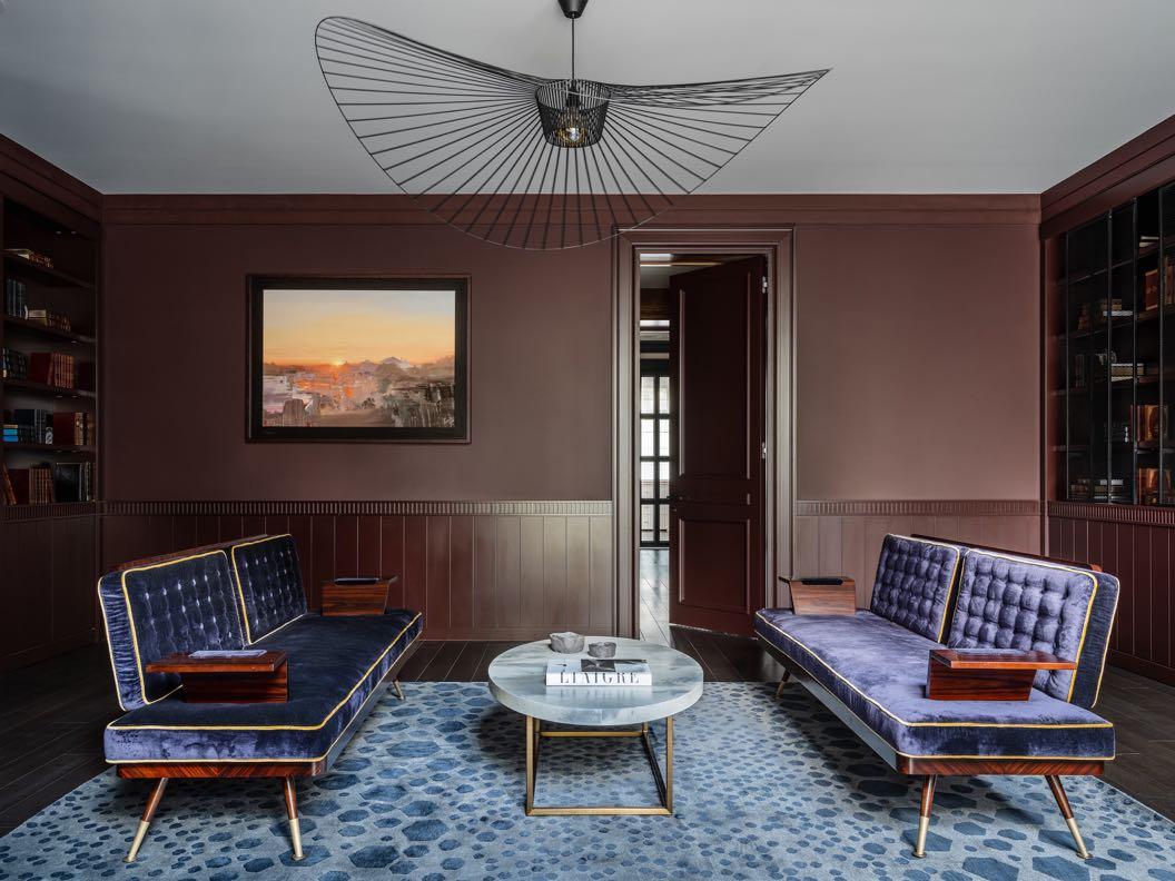 On the first floor a formal sitting room has also been reserved, accentuated by two Very Peri colored sofas with details in wood and metal. A carpet in blue tones stands out on the burgundy / cherry colored flooring, that covers the whole floor. This floor includes also the sleeping area where every space is thoughtfully designed