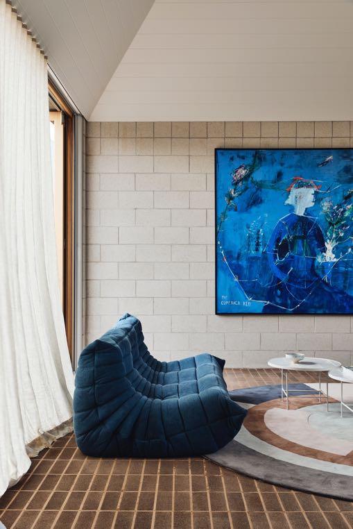 between the long façade and the garage, an outdoor shower is provided for washing down the wet gears from the sea, before the space opens up to the inner outdoor sanctum. Instead, walking on the walkway, from a huge French window on the left you can glimpse a living room with two blue sofas. There are also a couple of artworks, some white coffee tables - all assembled with a round rug in different colours.