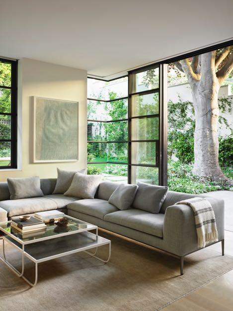 The living room leads to the dining area where a commanding Ilse Crawford brass console nods to the grandeur of the home’s original Edwardian style. Its presence is amplified by the home’s nuanced color palette and balanced with a bold, black and white contemporary art piece featuring striking geometric forms. The harmony between classic and contemporary continues in the backyard addition. The steel-cased glass box