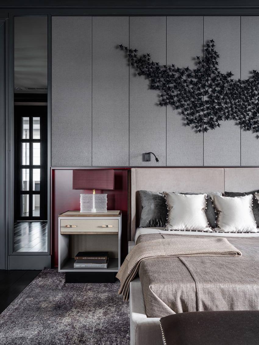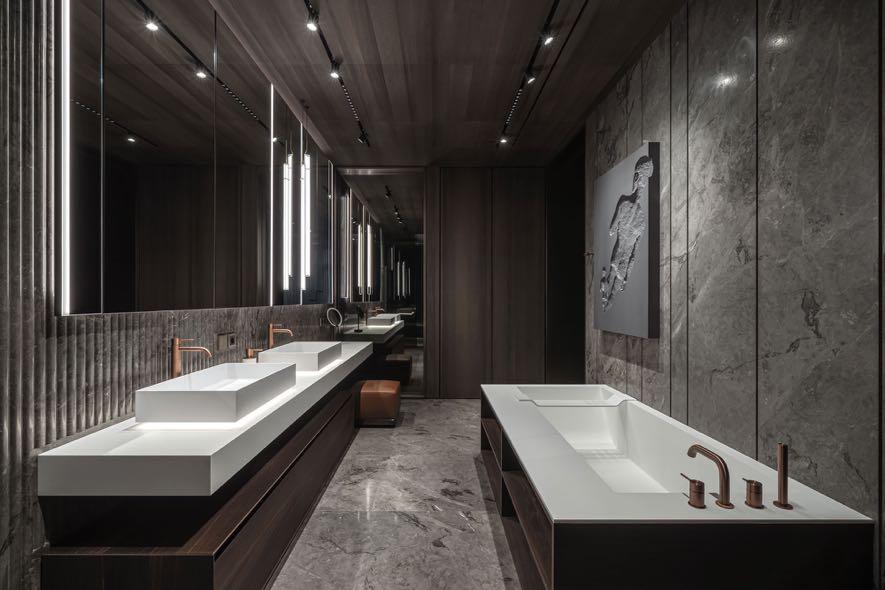 The recreation areas have a zoning technique, where walls or floors merge into each other and support the overall concept of the space. For example, a common stone wall has been designed in the master bedroom and the bathroom, hinting at the unified concept of the two spaces. Dark brown veneer turning into bronzeburgundy brass, stone wall combined with a metal, dark palette of the chamber bathroom, which is extended in the master bedroom — if you walk through these apartments, the connection is obvious. Each new element is a visual continuation of the previous one, and it creates a subtle but perceptible bond between the premises.