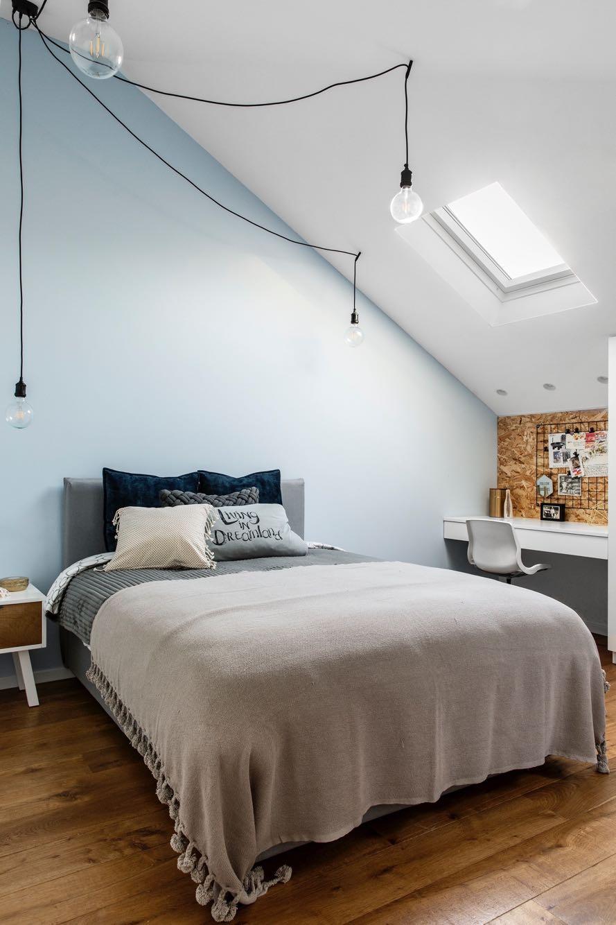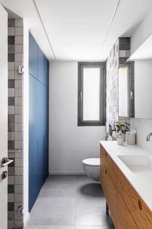 The attic is destinated for the eldest daughter. Her bedroom utilizes the ceiling slope in favor of additional storage combined with a work area. A light gray bed combined with a light blue wall create a young and clean look. The daughter's bathroom is also in blue and gray, combined with a bamboo cabinet in a special design that utilizes the sloping space in the optimal way.