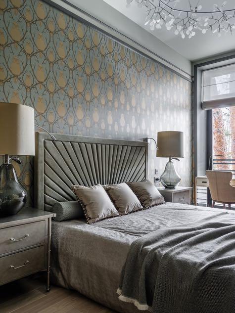 The master bedroom resembles the style small houses along the seaside. Here, the designers created two bathrooms and two wardrobes. Her dressing room and bathroom are silver and white with elements of blue while his spaces are brown and beige.