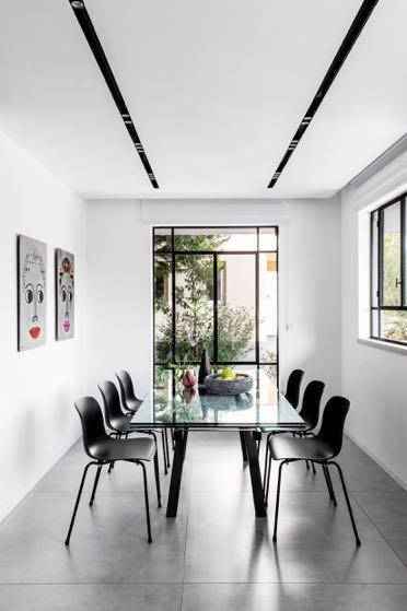 To the right, we find the living room with a graphite gray sofa, a denim one and the small coffee tables that allow for versatility and practicality in hospitality. A large vintage rug in shades of blue-purple borders the seating area. Linen curtains in a light gray shade were chosen which continue the "effortless" look. Above the sofa are two paintings by the artist Tali Minzer hung asymmetrically. The Belgian iron windows are black, framing the green view of the courtyard from all the windows. A seating area with a sofa and armchairs is located under the pergola and next to it an outdoor dining area, a grill area and a swing bench.