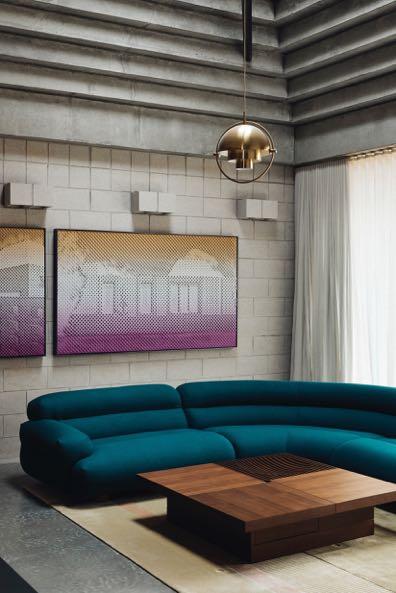 Once inside the house, the 2 largest of the frustum roofs reveal their internal structure: reverse step concrete pyramids. The skylight in the centre of them provide all day illumination to the spaces. The heaviness of the structure makes the external masonry feel like eggshells, with complex engineering and detailing make the exteriors all the more minimal. On the right the first pyramid surrounds the living area composed of a bright blue corner sofa that form a geometric contrast with the rest of the room marked by sharp edges and straight lines. On one wall, the architects hung two paintings with pink and yellow shades to give the room a warm touch. There are also artworks on the opposite side, but with a different style: the various shapes in black on a white background. Two black armchairs have been positioned below. Finally, a brass suspension in the center of the room brings a touch of shiny. Instead, continuing straight, the second