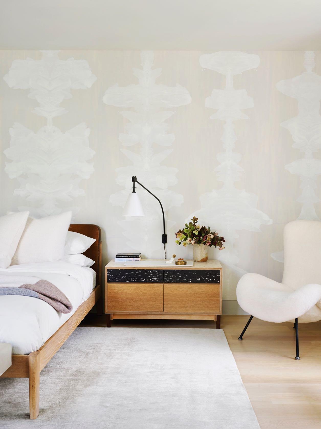 The master zone consists of a dressing room and a master bedroom with a private bathroom, and it is adjoined by another room a guest bedroom, which is designed so that later it could be converted into a nursery. The latter follows the neutral tones of the house: the bed of the Italian brand Ivano Redaelli is accompanied by the Minotti armchair and the brass Henge suspensions. A large wardrobe, also by Minotti, has been positioned along one wall.