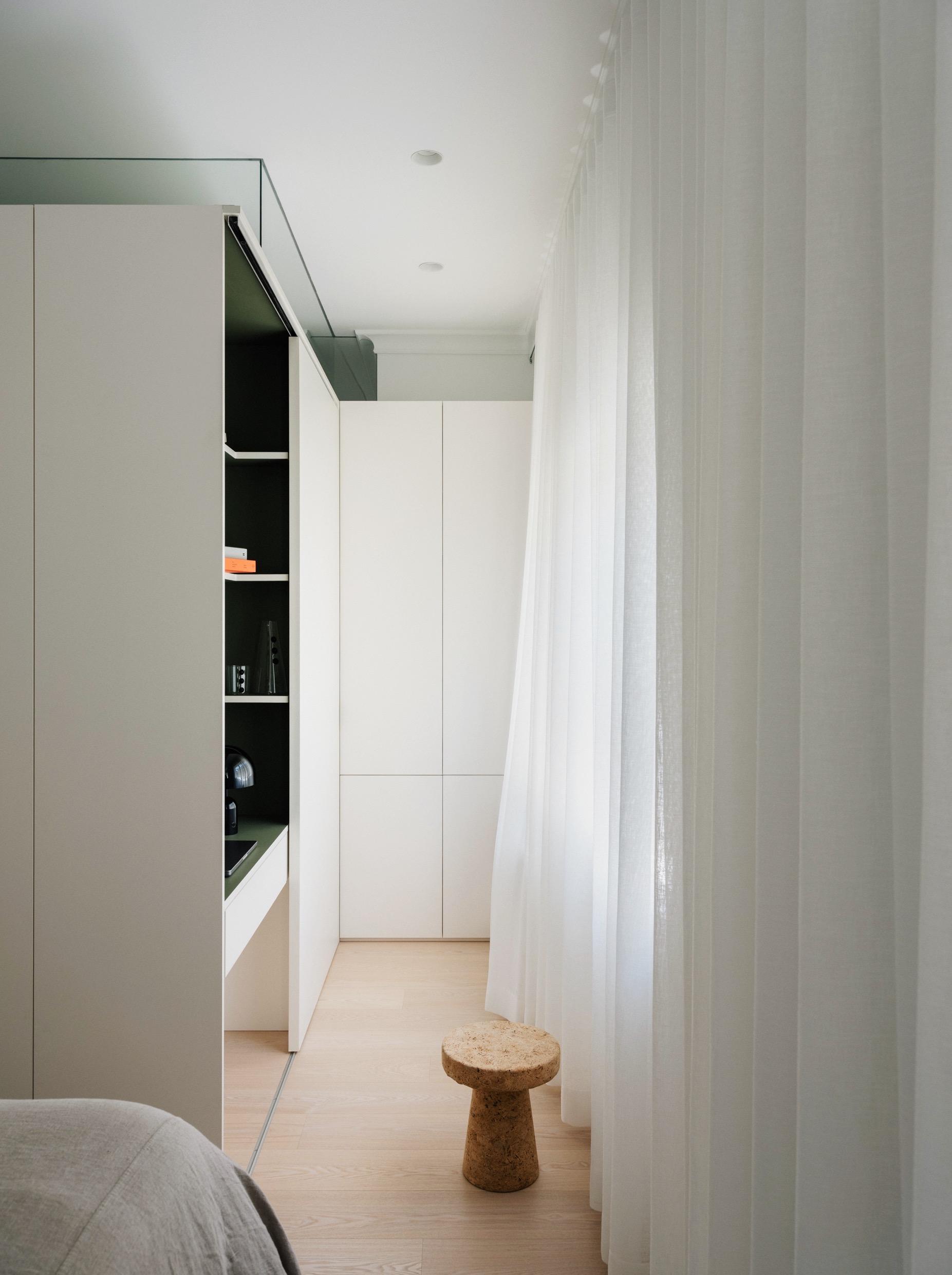 The master bedroom is accessed from the living room. It is warm with white, walnut wood and a leather bedhead. The curtains are in beige linen.