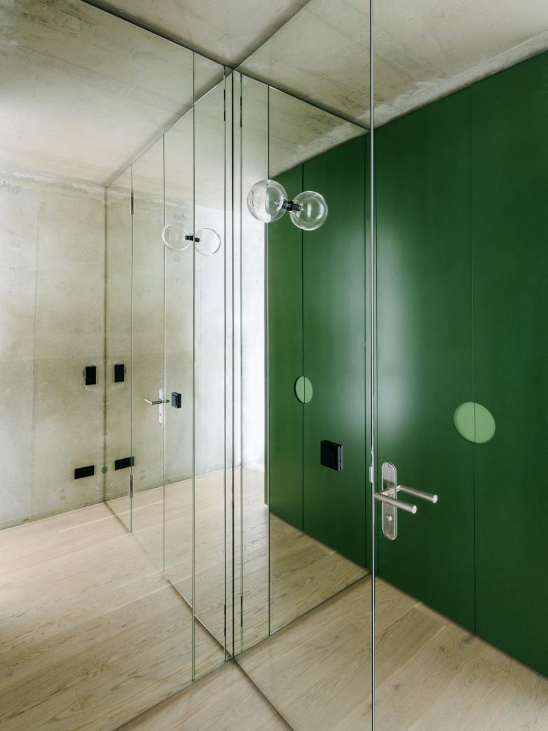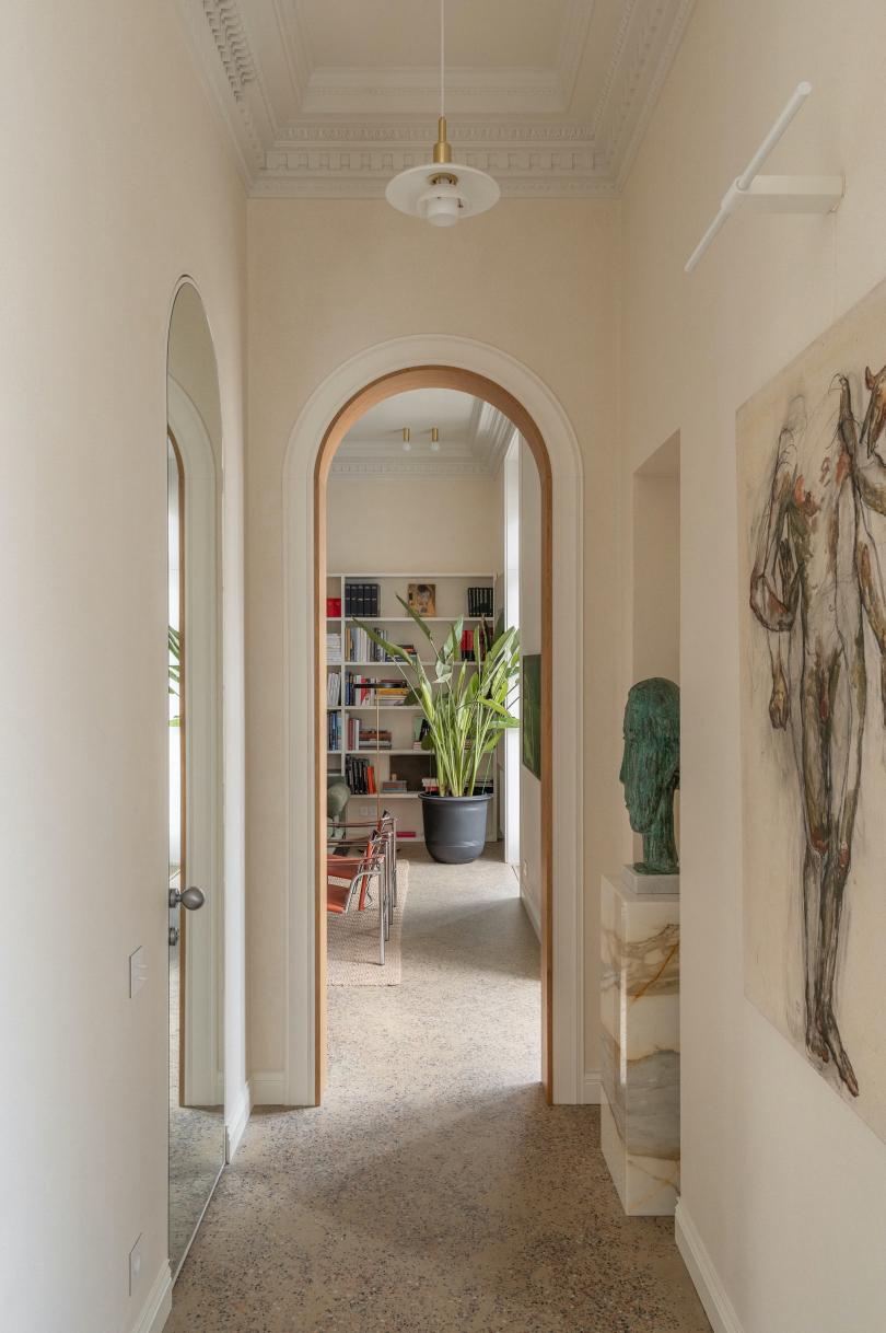 balcony, served as the cornerstone of the project's concept. The corridor, acting as the central artery, extends throughout the entire apartment, seamlessly integrating all areas into a cohesive space. The entrance is highlighted by a green colour, on the left a large round mirror is accompanied by a bench, in front of which an illuminated wooden wardrobe niche has been created. The main door was also painted the same color and features moldings following the style of the house. From here we can glimpse the choice to use arches to delimit each space instead of inserting doors. They have been enhanced to exude sophistication, achieved through the fusion of decorative molding and an inner wooden frame. Paintings and Louis Pulsen's glass pendants adorn the corridor.