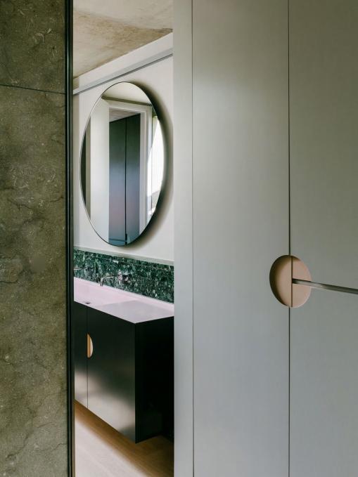 To the left at the entrance behind a door is the powder room characterized by the enveloping green marble covering the floor, the sink and a part of the wall that hides the toilet box (it also doubles as a shelf). A custom-made piece of furniture in walnut wood contrasts the cold of the marble. The day and night spaces are separated with a long continuous walnut wood element from east to west that contains and hides the laundry, storage, the bookcase and a home cinema. Walnut wood and stainless steel were used in the bookcase to bring some warmth into the space.