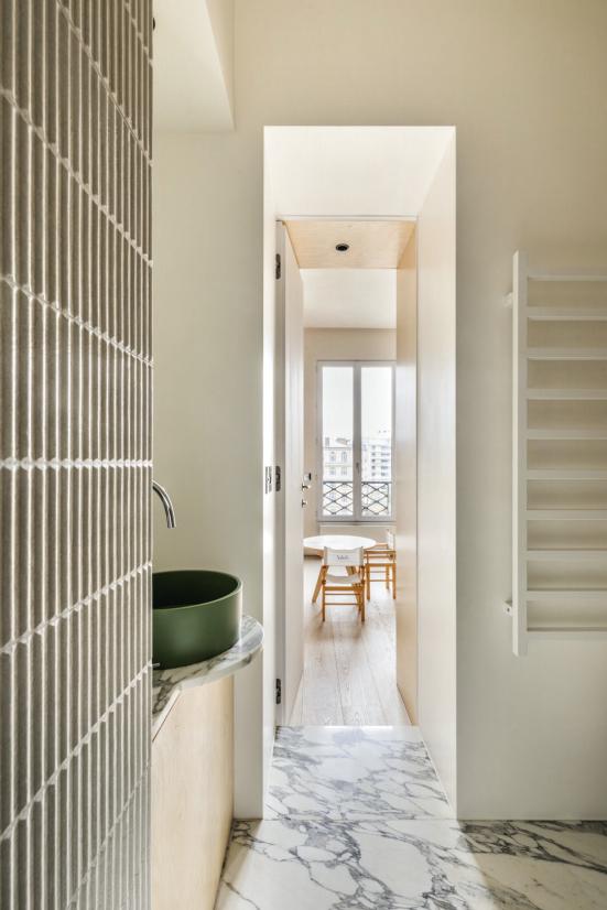 Since the apartment is located on the 5th floor, the views are very impressive, and Gabrielle Toledano wanted to highlight that quality. Above all in a dense city like Paris, light is one of the main elements to enhance. The 100 m² apartment is designed for the family of 4: Gabrielle, her husband (also an architect) and two small children.