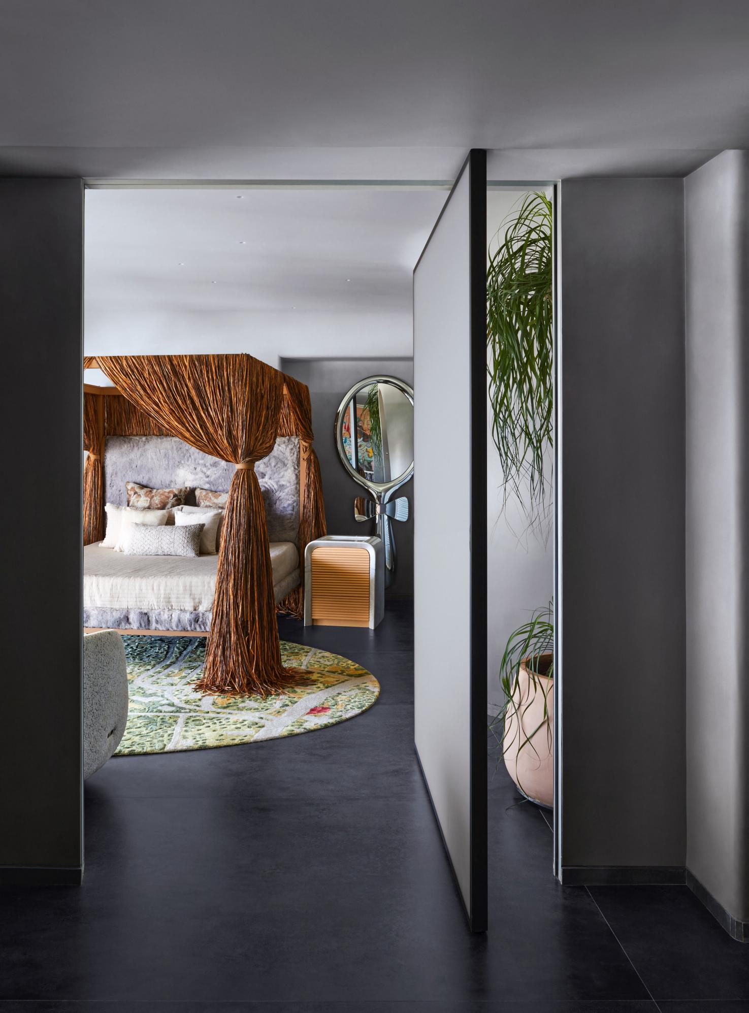 Tucked away in an intimate corner of the home and with its arched entryway and doorway to the bathroom, the bedroom quite literally appears like a man cave. The primitive hut-inspired bed by Edra evokes sensuality and mystery (it was also the first