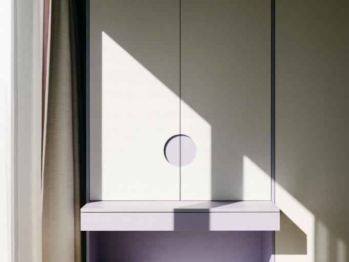 bathroom, where it transforms into a vanity, blurring the boundaries between spaces. To ensure natural light filters throughout, the bathroom wall has been replaced with frosted glass dividers, allowing western sunlight to grace the entire apartment.