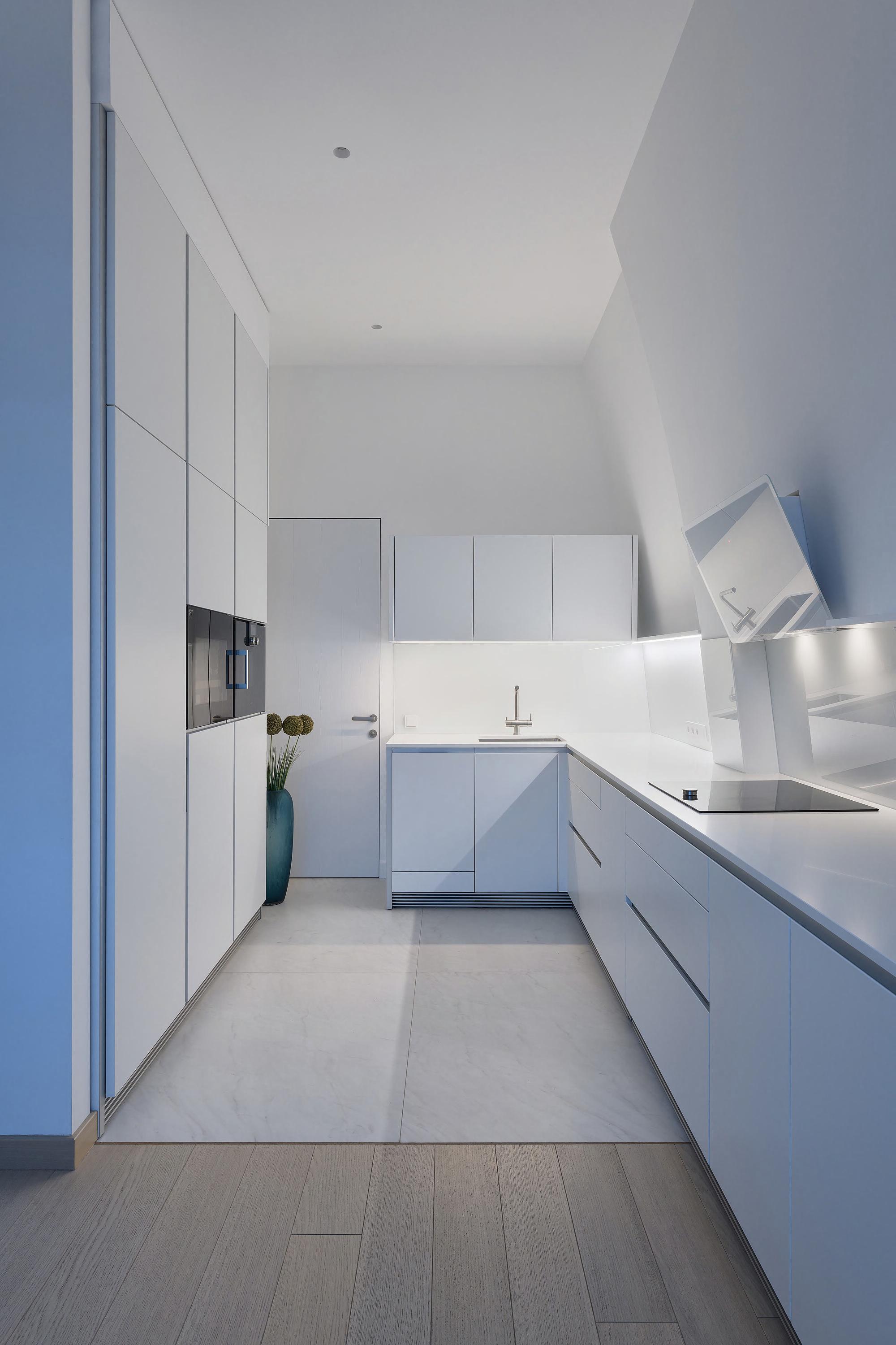 Entering the house, on the left we find the living room where the full-height mirrors have been installed, running the length of a wall to create a sense of spaciousness. The white sofa without armrests with the attached pouf form perfect seats for relaxing. Double-sided bookshelves create a functional divide between the living space and dining area; the latter is the brightest area of the house as it faces north. Here, Tsai Design has utilised white flooring to enhance light reflection, creating a winter garden ambiance since there is no outdoor space with the apartment.