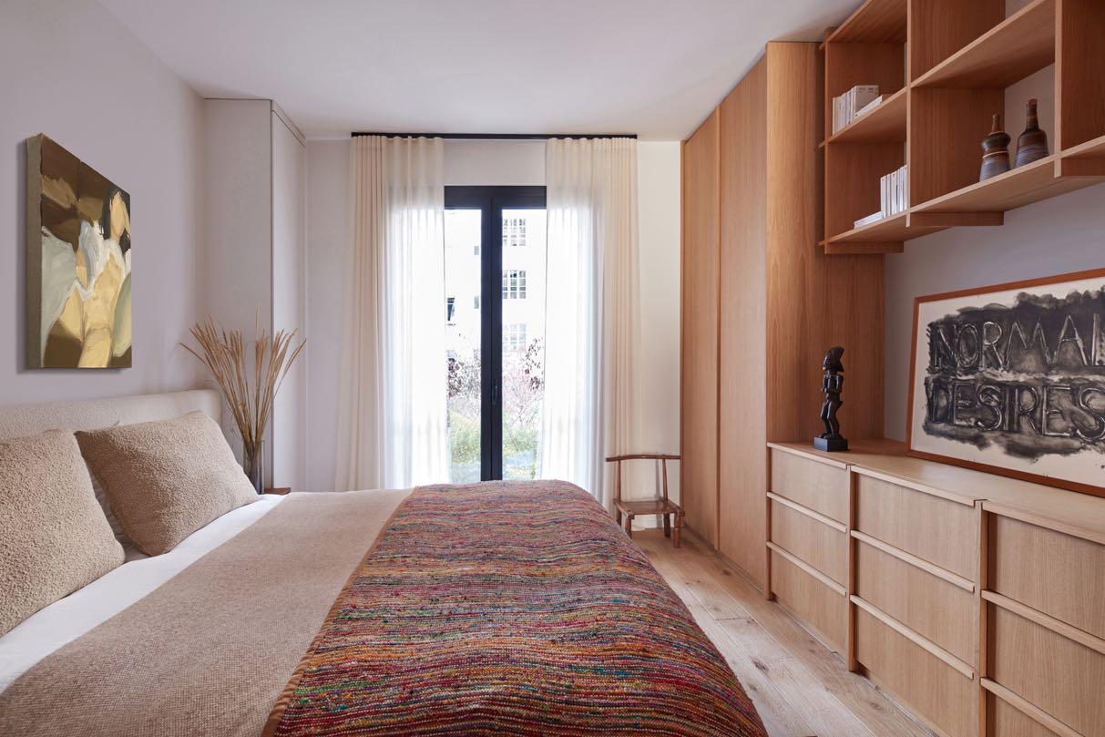 Like the rest of the house, the bedroom is awash in warm tones and the abundant use of wood. The wardrobes and the bookcase, always made to measure, are positioned on one side to give a homogenous style to the environment. Sandra Benhamou has given a strong weight to the textures: the bed in light beige tones as well as the bed linen give a greater sense of warmth while a plaid with