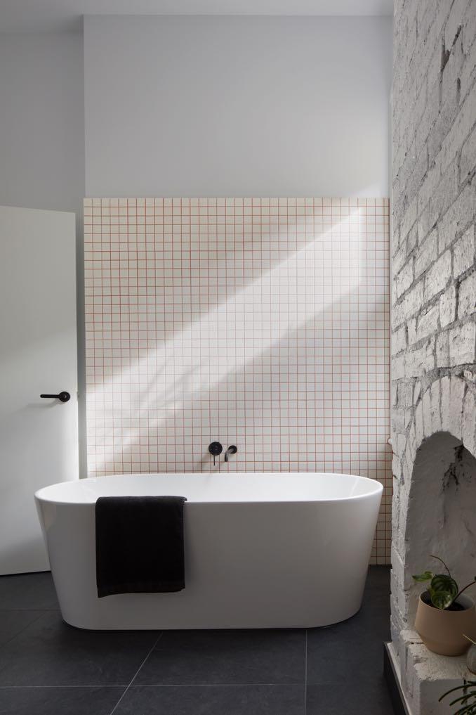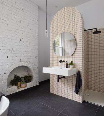 On the ground floor the verandah, front entry and main bedroom with a fireplace had its original cottage character retained and restored. The second bedroom was converted into a combined bathroom laundry while still retaining the room’s heritage proportions and features. This was achieved by inserting shaped tiled partitions to create different zones, rather than carving up the room with full height walls. The shower and laundry are concealed behind an arched vanity wall, which references and addresses the original brick fireplace. Small mosaic tiles with terracotta grout and the imperfection of existing brickwork add texture and boldness to this simple compact space.