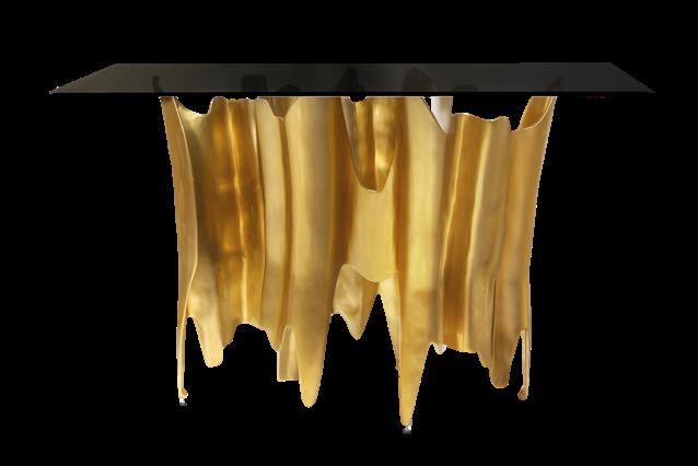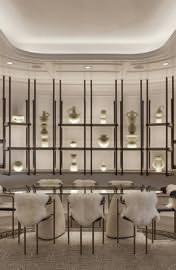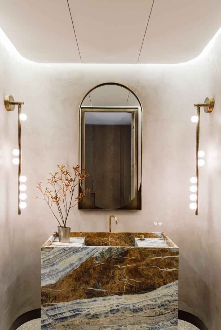 Another ambiance with an amazing design is the powder room where a stone vanity in figural Cassiopeia marble is the protagonist. In additional, MKCA have made an interesting architectural choice by making the curved Venetian plaster walls with LED cove lighting. The design is completed with opulent lighting from Lindsey Adelman's 2 gold-trimmed wall lights and a custom Kin and Company bronze mirror.