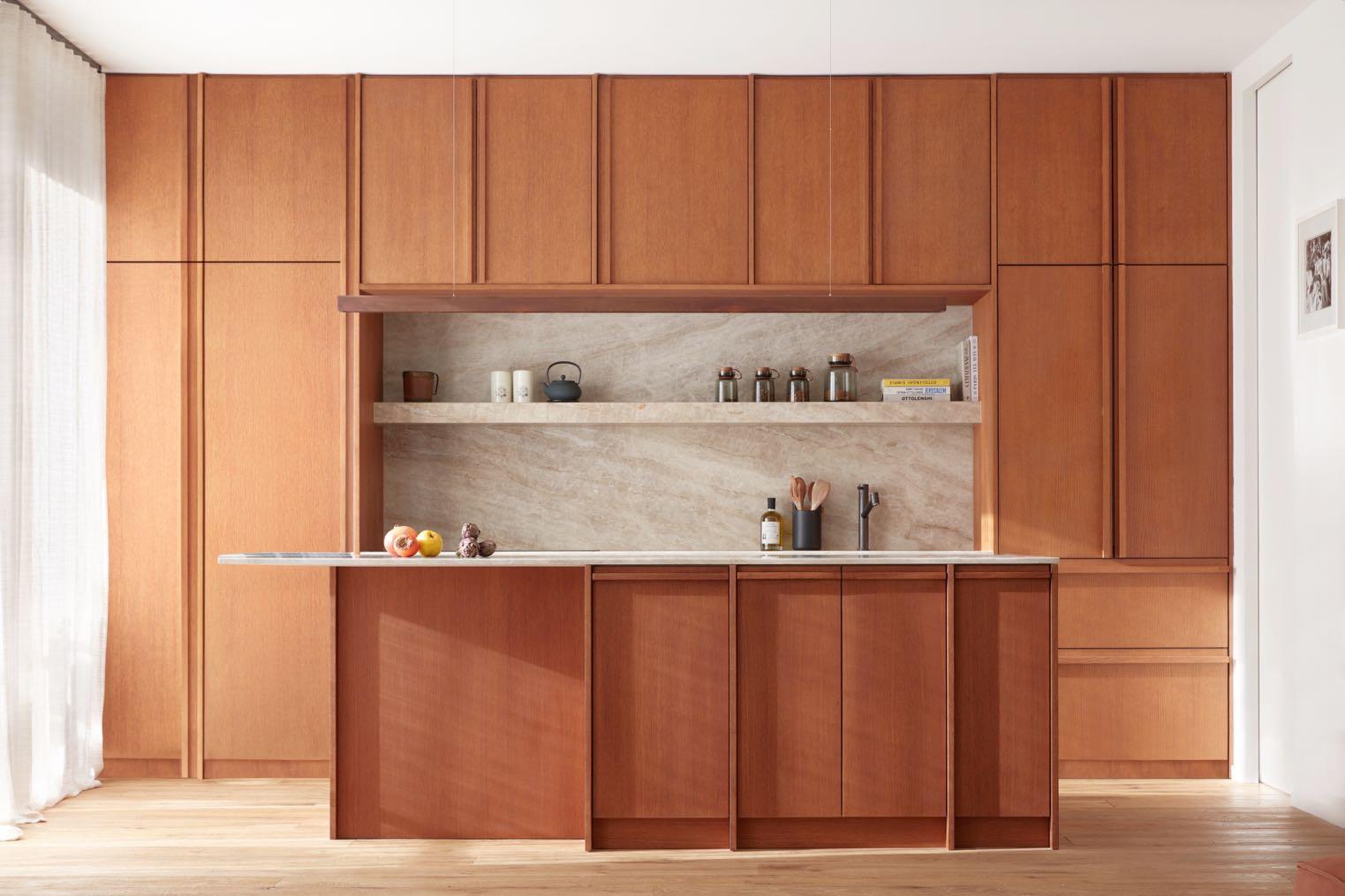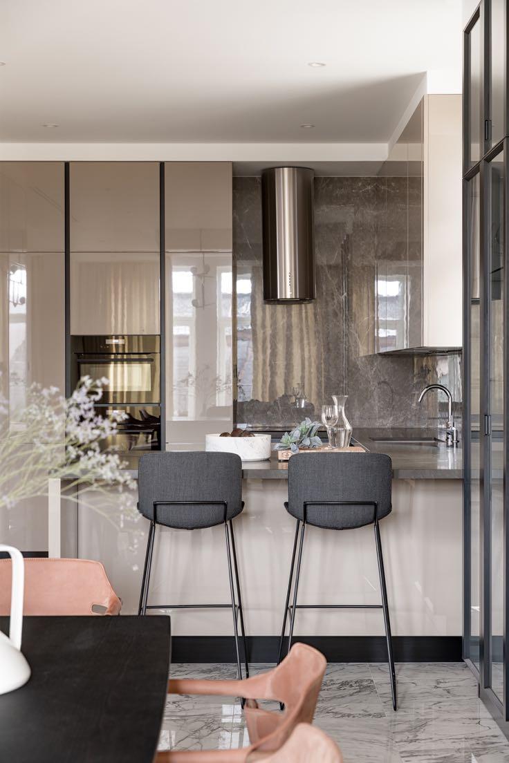 In the kitchen, a muscular island with hefty stone legs is set against ribbed walnut paneling. Its worktop - a mix of Cristallo and Ice Grey marble, blends perfectly with the rest of the room . Above it, a “Coax” pendant by John Hogan for Roll and Hill has been placed while some black stools with gold finishes give a touch of elegance.