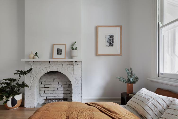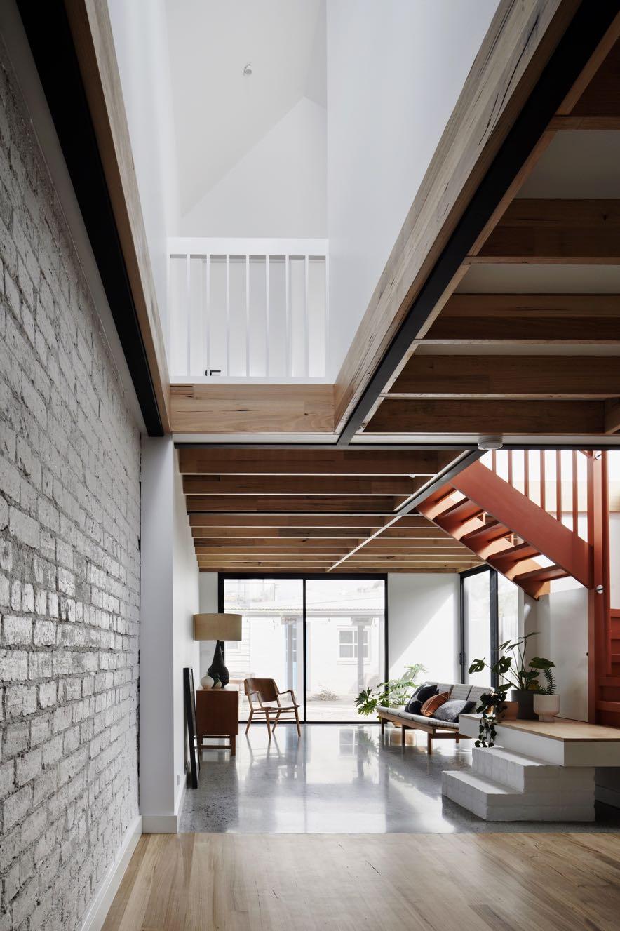 The architects introduced a first floor that could accommodate the kids’ bedrooms and bathroom, but just as importantly, provide void spaces that would allow Northern and Western light to penetrate the lower floor living spaces. The tight site and planning conditions informed the sharp asymmetrical roofline resulting in a soaring peaked internal ceiling. An abundance of natural light refracting off all white interiors creates a sense of the ethereal hidden amongst the urban grain. Externally, the first-floor addition peeks subtly above existing undulating rooflines from the rear laneway and is entirely invisible from the front heritage façade. A triangular gap between old and new rooflines provided opportunity to bring Northern light into the lower floors via a light void. This aperture acts as a sun dial projecting a triangular beam of light across the walls throughout the day. With the owners’ desire for raw character the first-floor addition structure was designed to be on display. Timber floor joists are exposed and structural steel beams frame void openings. The architects opted for some cost-saving measures which led to opportunities for bold interventions. An off the shelf staircase was emboldened with Dulux 'Simply Terracotta' which tied in the terracotta tiles and grout featured elsewhere in the interiors. The upstairs bedroom floors were simply sheeted and painted with Dulux 'Asparagus Sprig' for a fresh and playful effect.