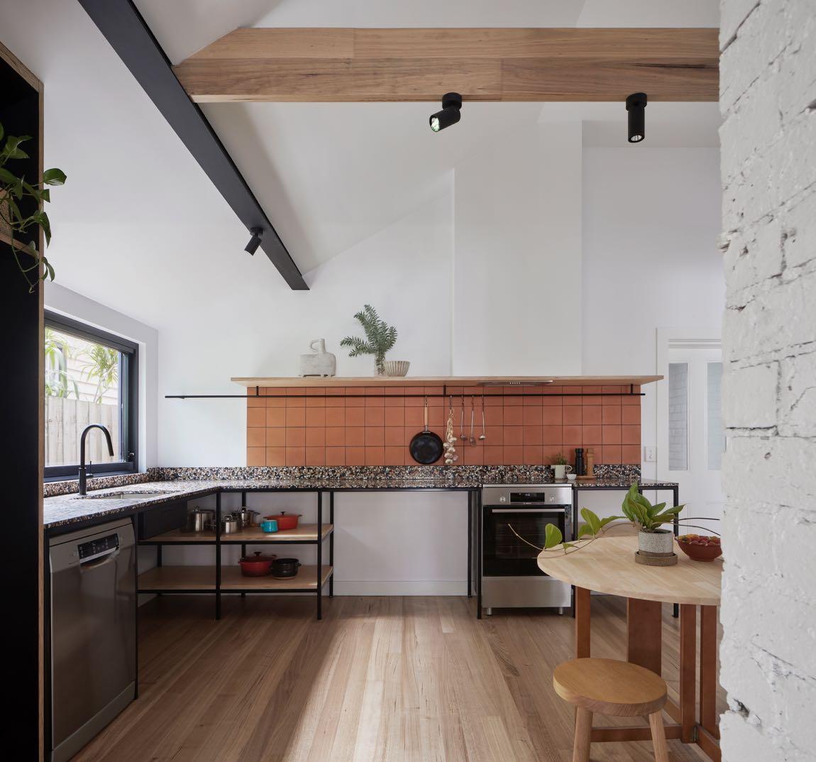 Beyond the original front rooms is the new open plan kitchen, which was formerly the living room. The richness of terracotta and terrazzo combined with black steel framing and ply detailing. The owners opted for open shelving and exposed fixtures, rather than conventional cabinetry, complimenting their desire for a flexible uncomplicated living arrangement. The kitchen consists of custom prefabricated steel frames and ply shelving made on site
