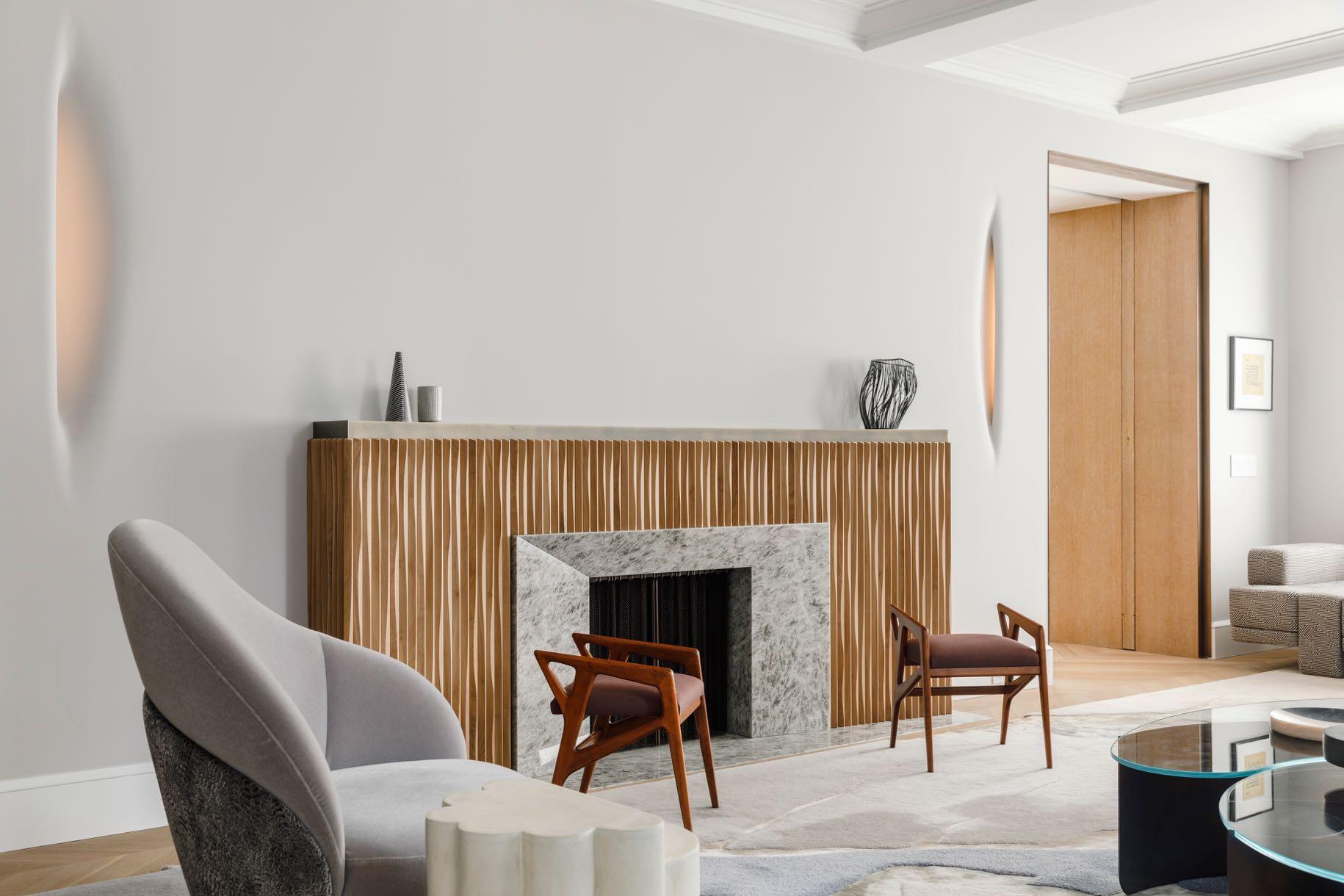 Through the folding doors, the dining room leads to the living room. Here, Kurtz’s custom carved wood sconces are enveloped within the thickened wall around the fireplace and glow gently through an integrated LED array. While the game tables and chairs resemble stacks of “pebbles” made from a mix of woods (oak, walnut, maple, cherry) and metals (aluminum and bronze). These are paired with a “Merrick” daybed by MKCA covered in a graphic chenille by Castel, a custom sofa by KGBL, covered in a Holland and Sherry wool jacquard, and "Tsunami" coffee table in heat treated steel and glass by Kin & Company. Additionally, a pair of vintage Gio Ponti stools and a customised "Fracture" rug by Fernando Mastrangelo through Edward Fields accent the space.