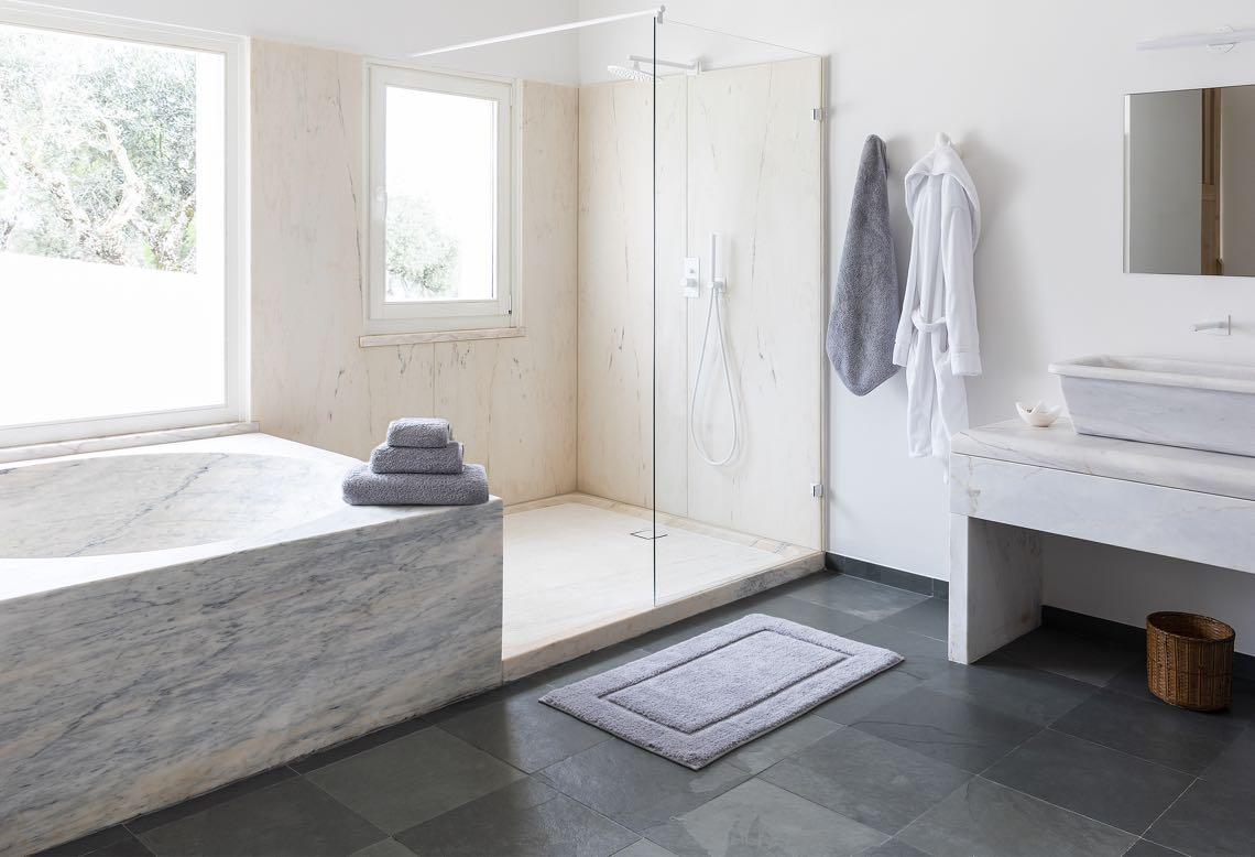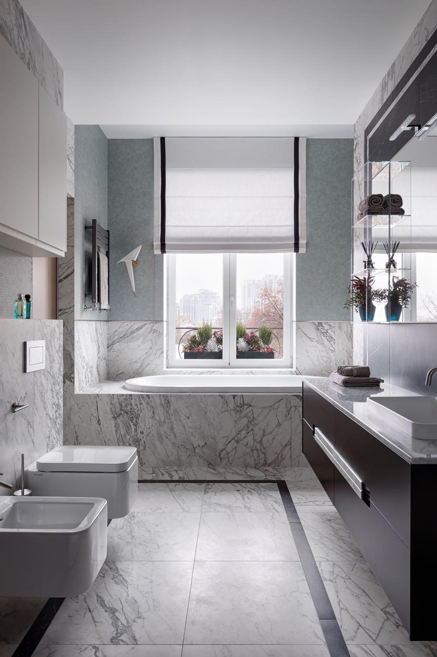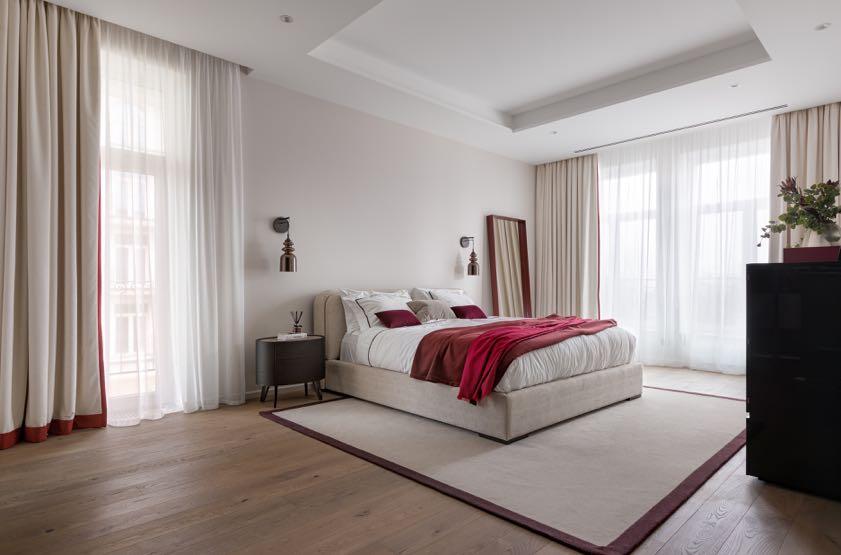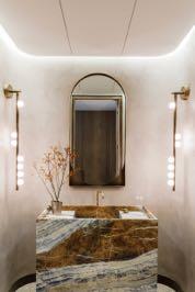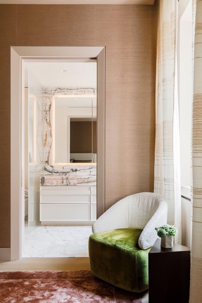 The en-suite bathroom has also the warm tones: it is enveloped in rosy Venetian plaster, pink Byzantine onyx, and Calacatta Vagli Rosato marble.