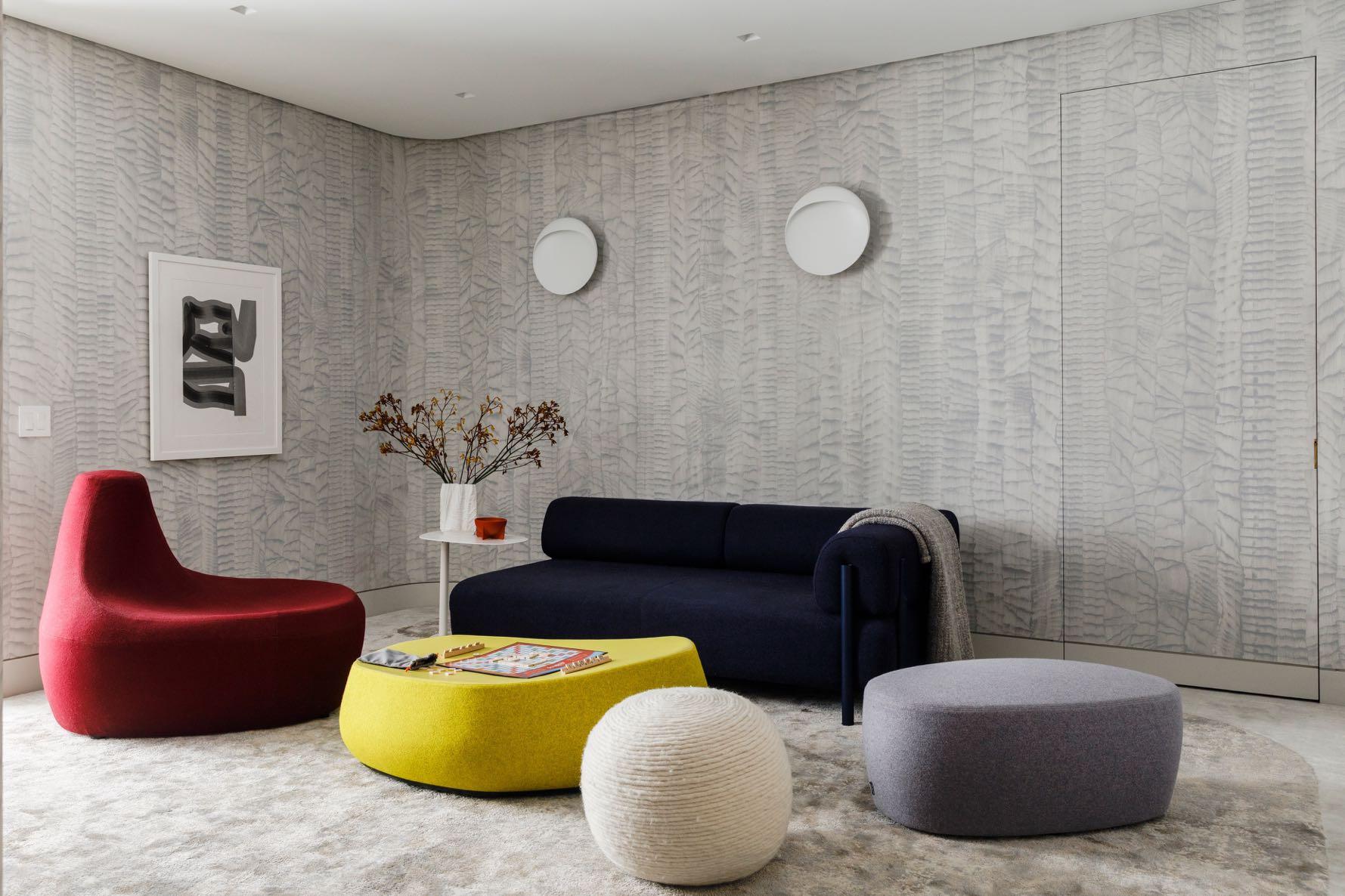 For the teenage children, a playroom has been reserved where they can spend time together. It's a hangout zone and TV space, with hand-printed wallcovering and a graphic carpet with a custom shape. Comfortable and modern seats were crucial in the choice of furnishings: a deep blue sofa by Hem and the vibrant lounge chair and poufs by Moroso. A hidden door has also been inserted leading to the laundry.