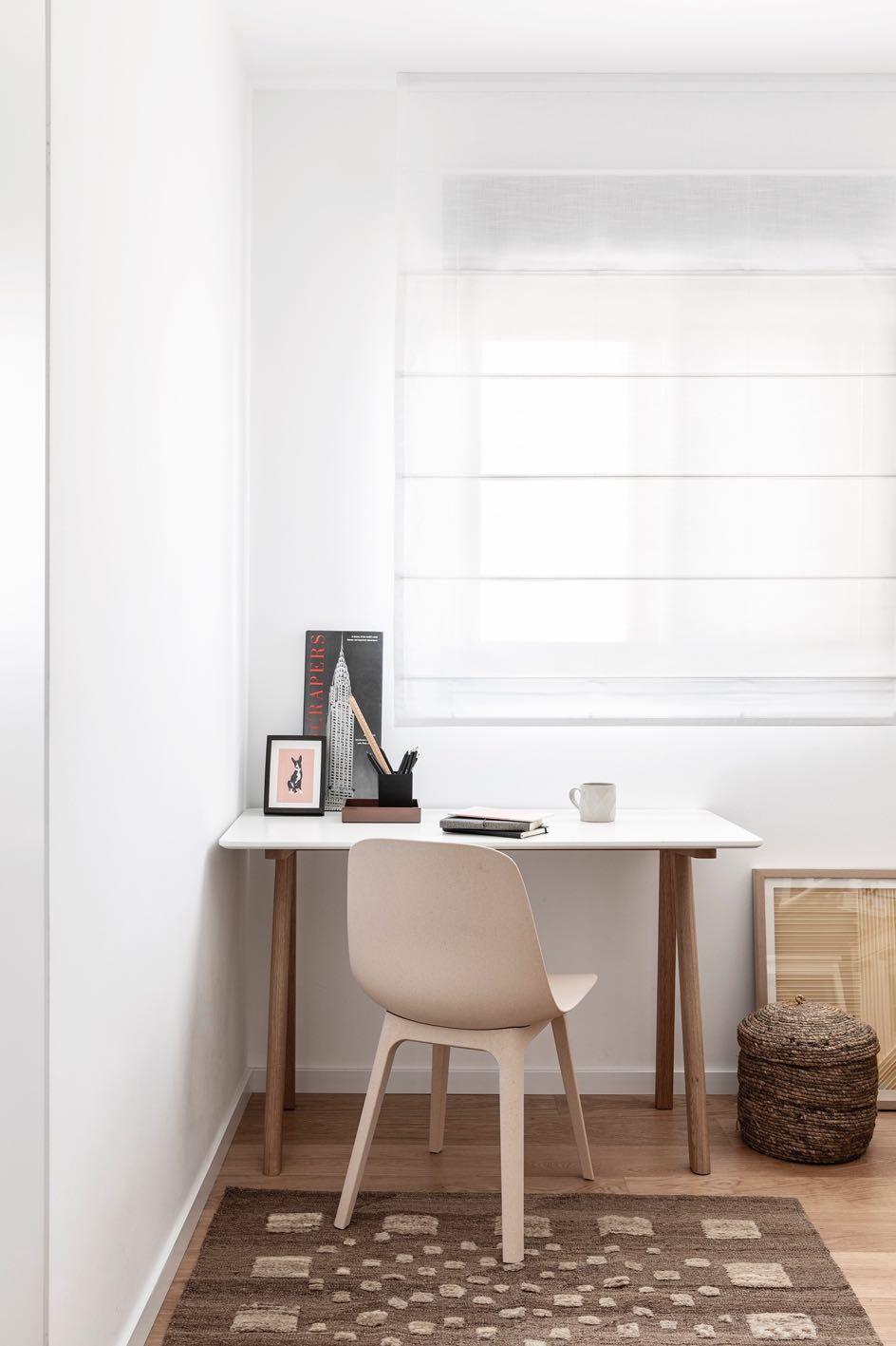 L-shaped space envelops an outdoor area that guarantees the penetration of natural light thanks to the large floor-to-ceiling windows. They allow the green views of the gardens to take center stage. Backed by a minimalist aesthetic of muted tones and clean lines, the interiors are light and airy, courtesy of high ceilings and sparse furnishings. The feel of an urban oasis is enhanced by a richly textured palette of handmade and natural materials, such as warm white plaster finishes, wooden floors and marble surfaces. The designers added a bolder turquoise for the kitchen to have some colorful accents.