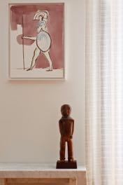 with a single leg with soft curves, is a true triumph of art and sculpture. A touch of modern is given by Hans Wegner's CH23 chairs with clean and organic contours. As customers are passionate about art, one piece to note is a painting by Camille Henrot. Below it we also find a Jenny Holzer bench and the African Ngbaka figurine from Galerie Lucas Ratton. Next to it there is a large window that floods the room with natural light while the white curtains guarantee privacy.