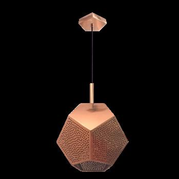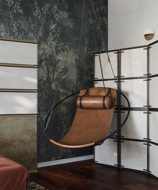 a customized MKCA pouf in leather, walnut and glass was placed. Above it, we find Bec Brittain's “Maxihedron” hanging pendant for Roll and Hill.