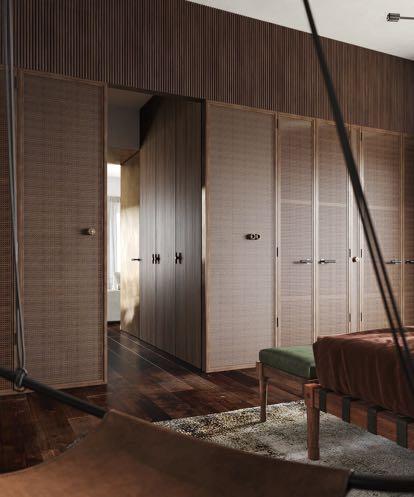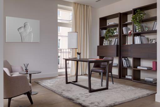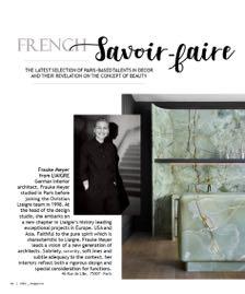 line wallpaper by Wall&deco’s that perfectly match the carpet below. Two white Flexform corner sofas were chosen for the seats, giving a sense of comfort while the traditional Tessa chair by Flexform pays tribute to the artisan heritage. A series of bronze fixtures, including pendant lights and modernist sconces by Emmanuelle Simon as sculptural highlights, infuses the home with exuberance. The result of such a thoughtful and meticulous design process is a residence of timeless sophistication that nonetheless feels fresh and modern.