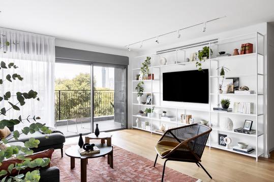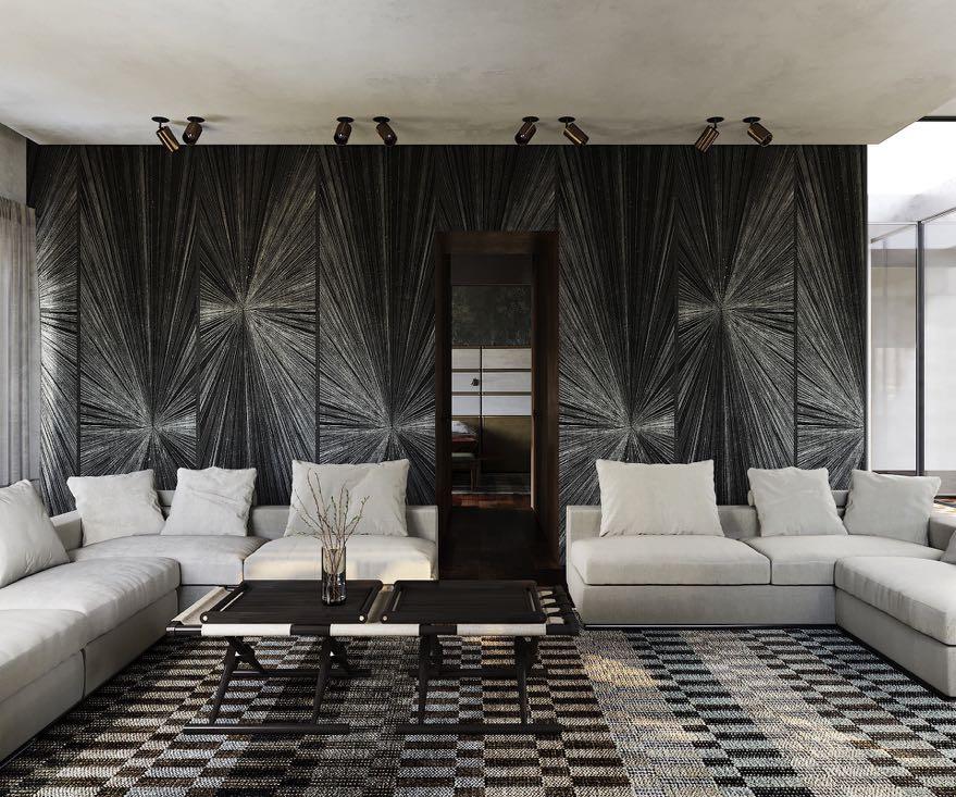 For the living room, the designers opted to add some geometric graphics and use neutral tones between black and white. One of the walls is revamped with Flash