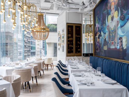 Sundukovy Sisters designed the interiors of a restaurant with Greek classic motifs re-thought in a modern, bright interpretation in the context of Hong Kong.