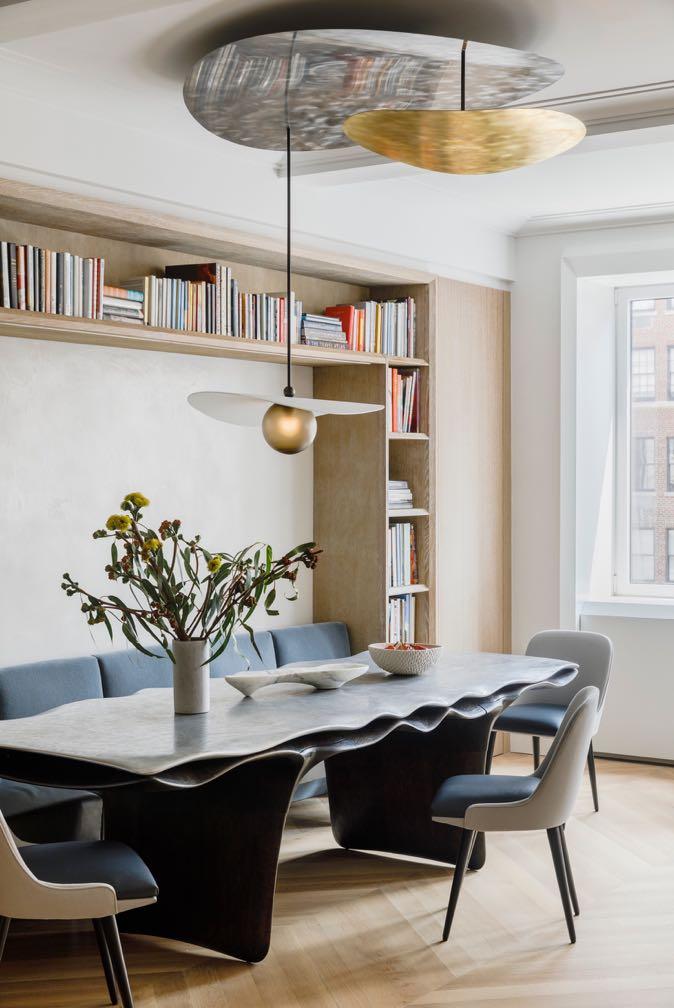 In keeping with MKCA’s overarching practice, the studio has designed and commissioned custom furniture across the home, with each piece bolstering the project’s emphasis on mutability, tactility, and elegance. Particular emphasis is placed on the dining room and library fused into one. The furniture anchoring this room transforms depending on the scenario: the banquette breaks apart into chairs, a custom chandelier by Ladies and Gentlemen Studio swivels, and the dining table expands. The latter is the result of an ongoing collaboration between MKCA and Christopher Kurtz, the Hudson Valley-based sculptor and designer. The piece features an undulating, carved aluminum top fused to a rippling underlayer and base in oxidized cherry.