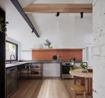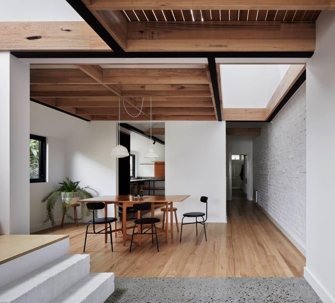 by the builder, eliminating the need for a conventional cabinet maker. Another retained original brick fireplace is the threshold into the new dining and living areas beyond. It is at this point that the house celebrates old and new, rough and smooth, dark and light. The homes history is displayed through retained rough textured brickwork located throughout the space, contrasting against crisp new plaster walls and polished concrete floors.