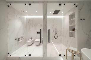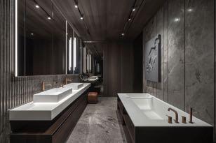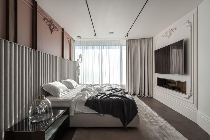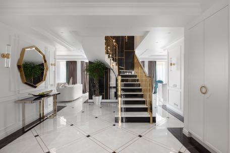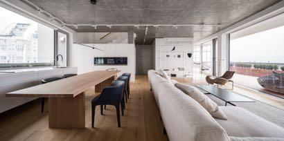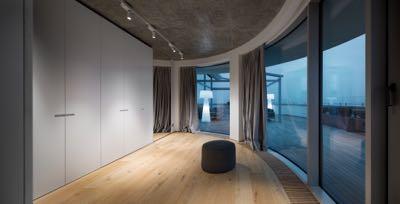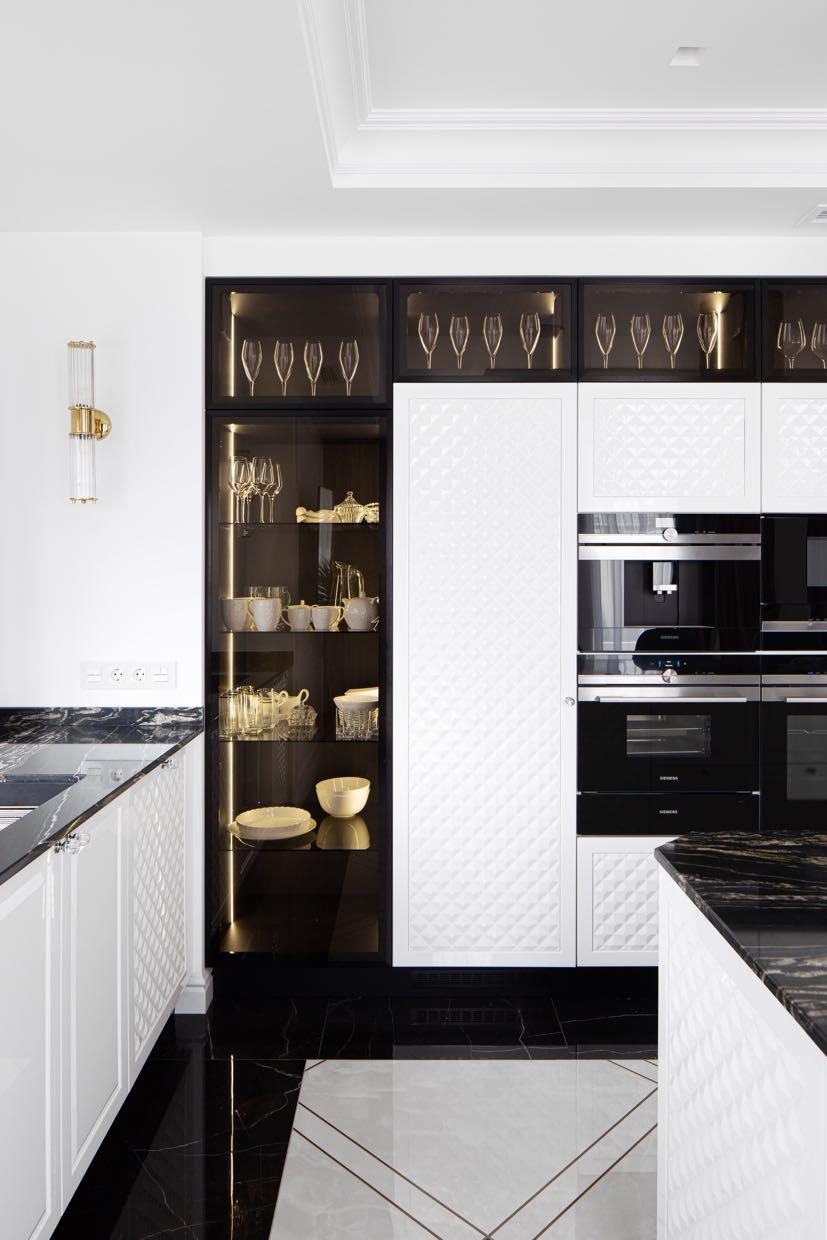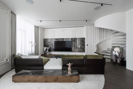 This 300m² apartment in Kyiv for a young family has a modern and minimalist design. The redesign logically and intuitively connects all rooms and spaces together. The apartment has all the necessary premises for customers: the open space consisting of living room, kitchen and dining area; master and guest bedrooms; a room for the child; the nanny room; a laundry and three bathrooms (main, guest and child). The open space, which includes kitchen, living room and dining room is conventionally divided by pylons, technical track lights, colors and textures. In the kitchen the clear shapes and contrasts prevail white, black and wood.