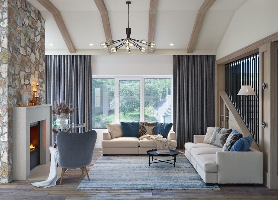 The compositional center of the living room, of course, is the fireplace. Also, the accent of this area is the staircase behind the sofa group, which is visible, but visually fenced with forged balusters. The kitchen and dining area are separate from the living room behind glass doors. The designers used wood and natural stone for designing of all rooms except the bathrooms where we find the large tile decorated with stone or wood. This surfaces today has beautiful and varied prints that perfect imitates natural materials.